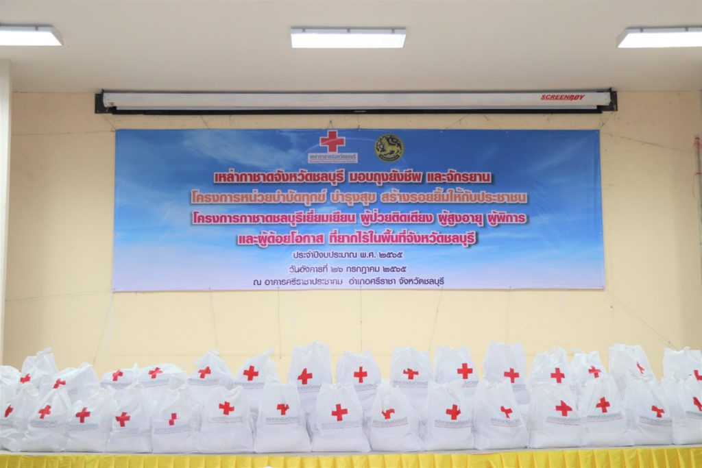 คณะกรรมการเหล่ากาชาดจังหวัดชลบุรี และสมาชิกเหล่ากาชาดจังหวัดชลบุรี ลงพื้นที่มอบถุงยังชีพตามโครงการมอบถุงยังชีพ