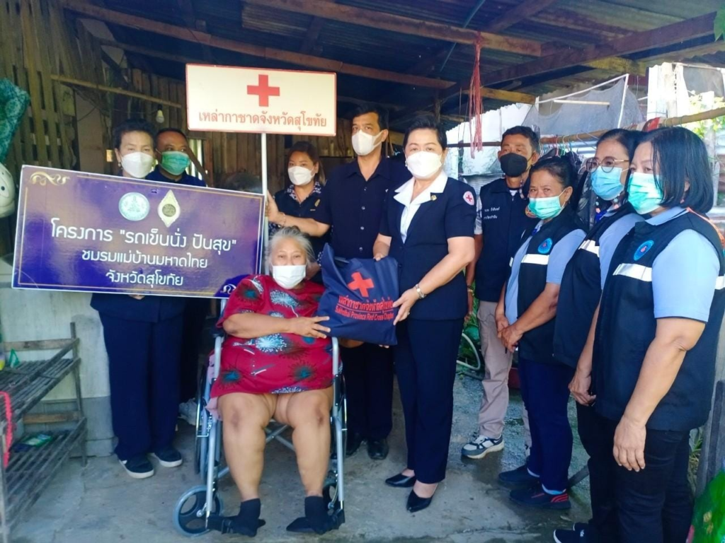 วันที่ 14 กันยายน 2565 นางกนกพร พรรณเทวี นายกเหล่ากาชาดจังหวัดสุโขทัย พร้อมด้วย กรรมการและสมาชิกเหล่ากาชาดจังหวัดสุโขทัย ปลัดอำเภอเมืองสุโขทัย อาสาสมัครสาธารณสุขประจำหมู่บ้านอำเภอเมืองสุโขทัย ผู้นำท้องที่ ผู้นำท้องถิ่น ลงพื้นที่มอบ รถเข็นนั่งปันสุข เพื่อมอบให้ประชาชนในจังหวัดสุโขทัย ในการช่วยเหลือด้านสังคมสงเคราะห์แก่ผู้ยากไร้ขาดแคลนกำลังทรัพย์และมีความบกพร่องทางการเคลื่อนไหว ให้สามารถประกอบภารกิจหรือช่วยเหลือตนเองได้มากขึ้น เฉลิมพระเกียรติ สมเด็จพระนางเจ้าสิริกิติ์พระบรมราชินีนาถ พระบรมราชชนนีพันปีหลวง สภานายิกาสภากาชาดไทยเนื่องในโอกาสมหามงคลเฉลิมพระชนมพรรษา 90 พรรษา 12 สิงหาคม 2565 โดยเหล่ากาชาดจังหวัดสุโขทัย ได้มอบถุงธารน้ำใจ ให้กับนางเสนอ จันทร์นาค บ้านเลขที่ 85/4 หมู่ที่ 3 ตำบลบ้านกล้วย อำเภอเมืองสุโขทัย จังหวัดสุโขทับ เพื่อบรรเทาความเดือดร้อนและช่วยเหลือในเบื้องต้น