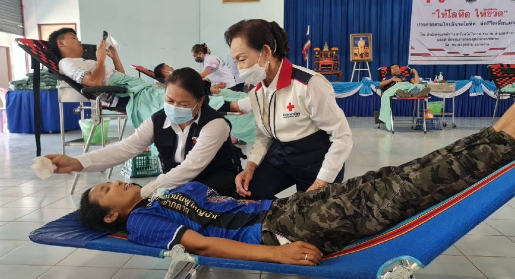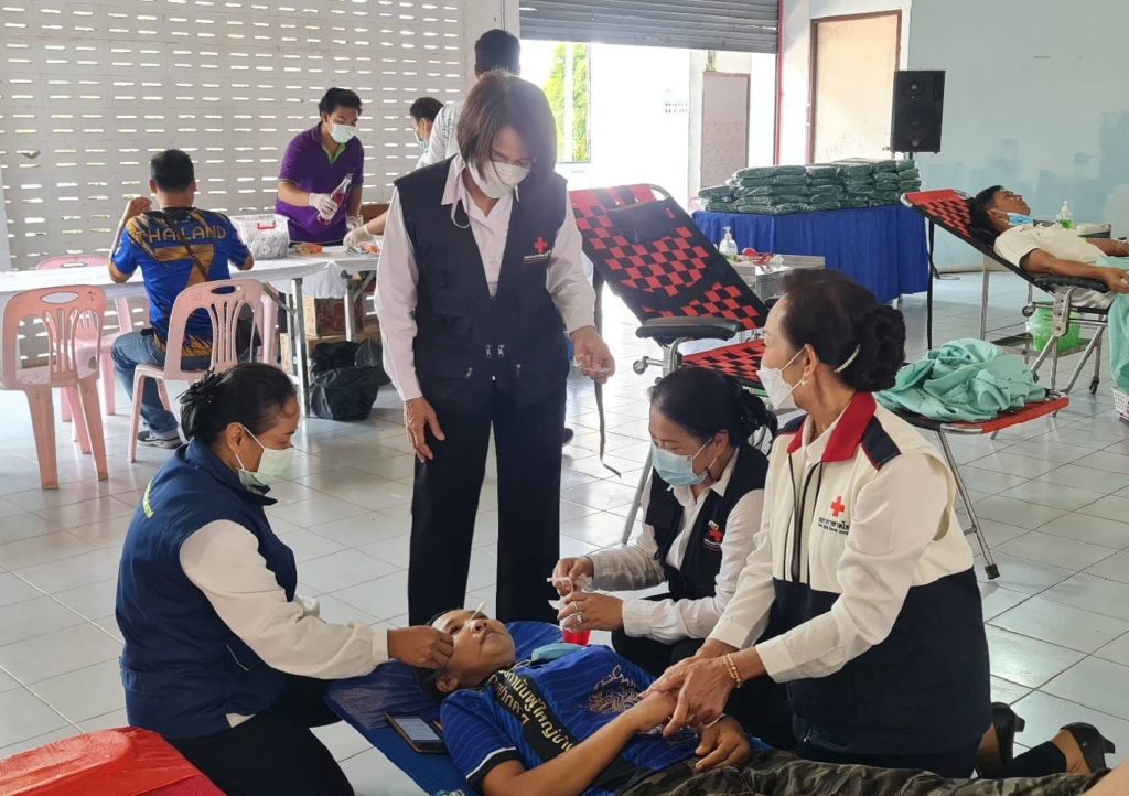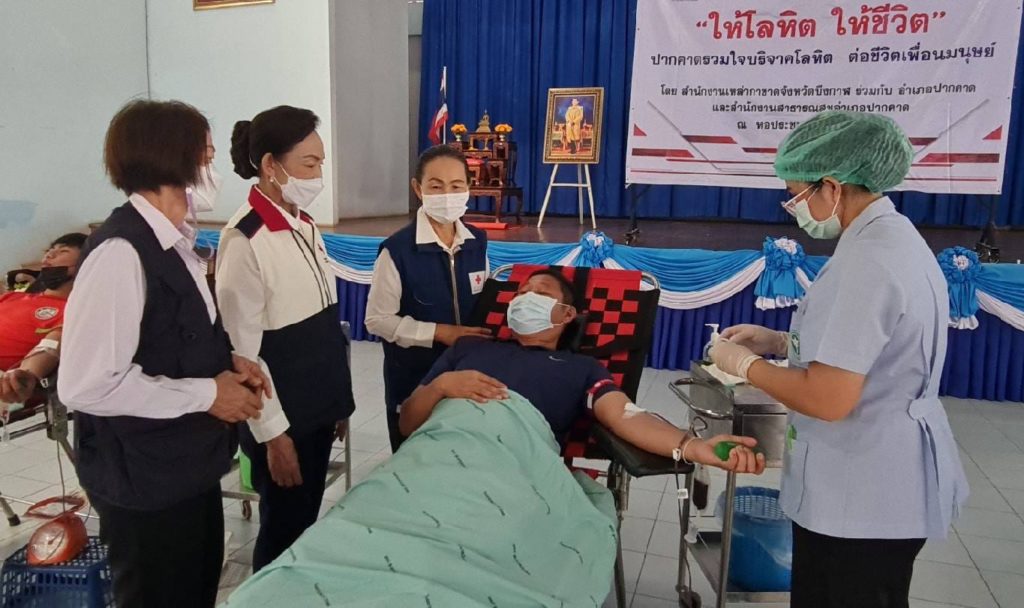 นางคำหมุน ยอดเทพ รองนายกเหล่ากาชาดจังหวัดบึงกาฬ ร่วมด้วย กรรมการและสมาชิกกาชาดอำเภอปากคาด หน่วยงานธนาคารเลือด