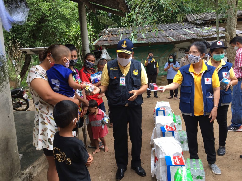 ในการนี้ เหล่ากาชาดจังหวัดตรังมอบชุดธารน้ำใจ คนละ 1 ชุด ผ้าอ้อมสำเร็จรูปและนมผงสำหรับเด็ก
