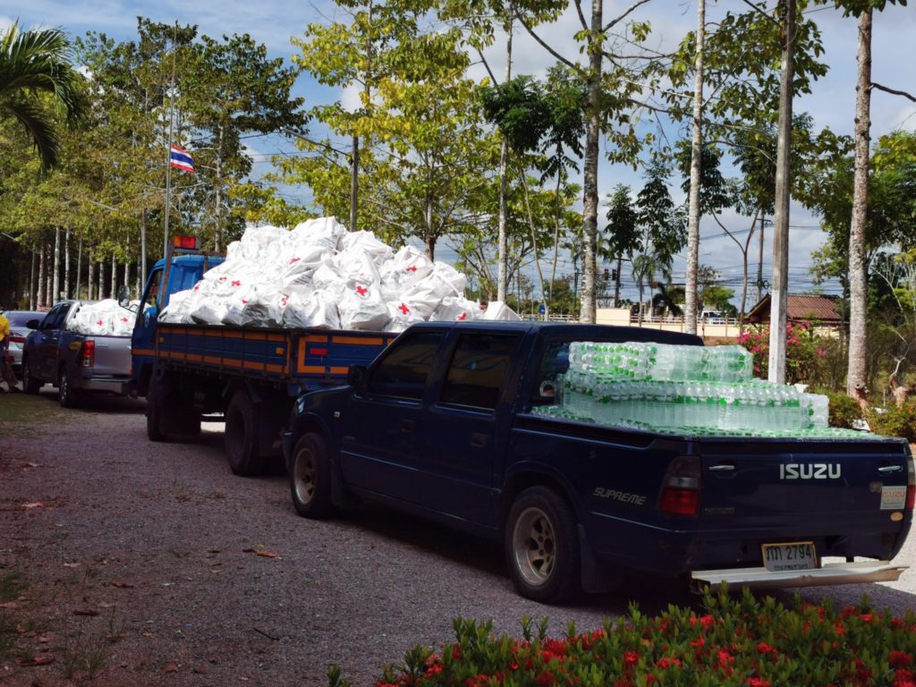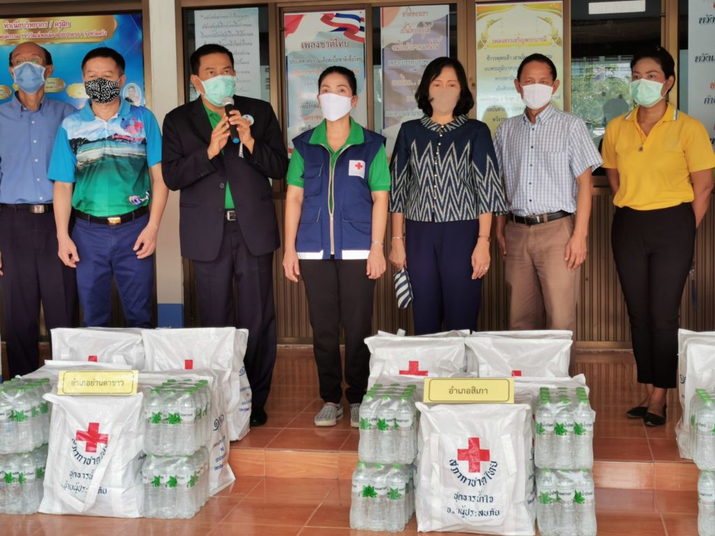 วันที่ 6 พฤษภาคม 2563 นายลือชัย เจริญทรัพย์ ผู้ว่าราชการจังหวัดตรัง พร้อมด้วยนางเอื้อจิตร เจริญทรัพย์ นายกเหล่ากาชาดจังหวัดตรัง ส่งมอบชุดธารน้ำใจสภากาชาดไทย จำนวน 1,514 ชุด ให้ทุกอำเภอในจังหวัดตรัง เพื่อนำไปแจกจ่ายให้กับผู้ที่เดินทางกลับมาจากจังหวัดภูเก็ต และต้องกักตัว 14 วัน ตามมาตรการป้องกันโรคระบาดของจังหวัดตรัง ในพื้นที่อำเภอที่ตนอาศัยอยู่