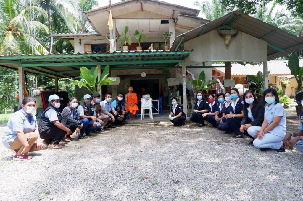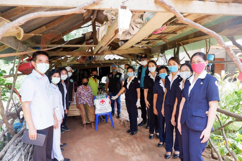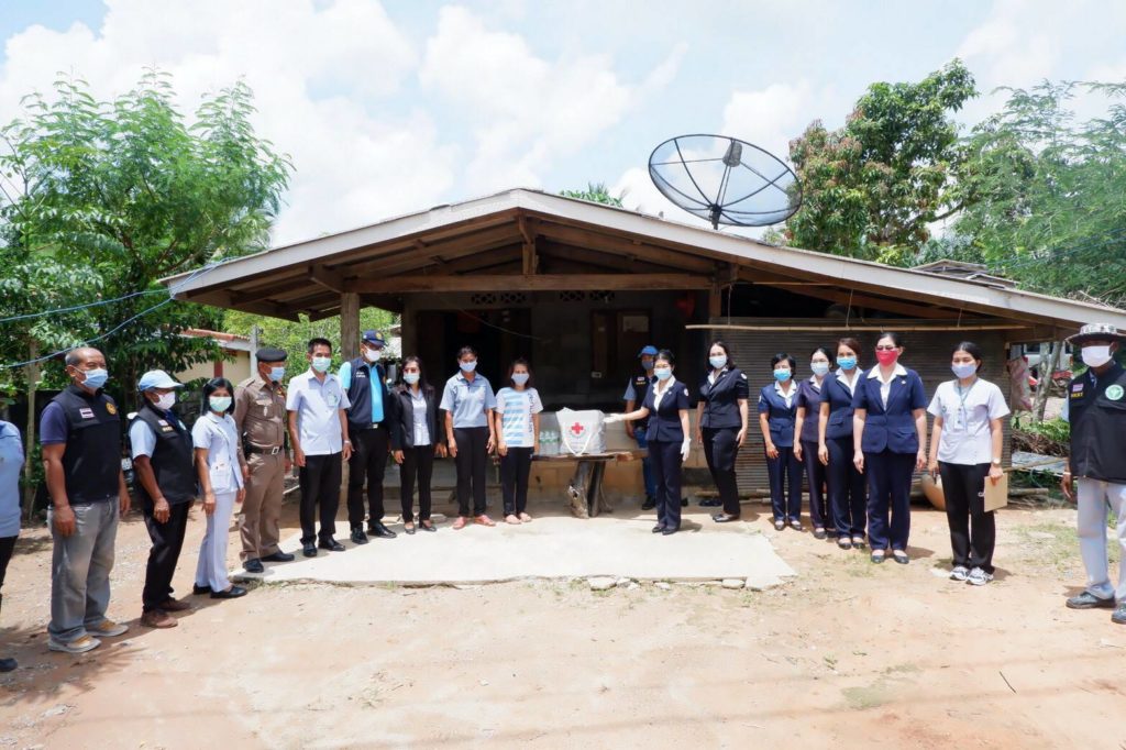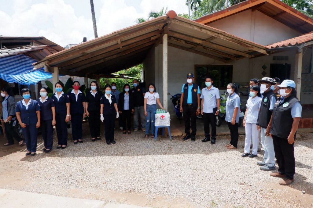 นางวิไล เพ็งอุดม ผอ.รพ.สต.คลองน้อย เจ้าหน้าที่สาธารณสุข อสม. กำนันและผู้ใหญ่บ้านร่วมลงพื้นที่อำเภอชัยบุรี จังหวัดสุราษฎร์ธานี เพื่อมอบชุดธารน้ำใจ ที่ได้รับจากสำนักงานบรรเทาทุกข์และประชานามัยพิทักษ์ สภากาชาดไทย