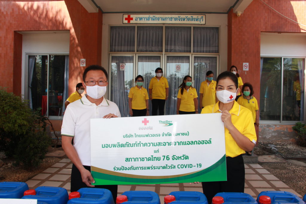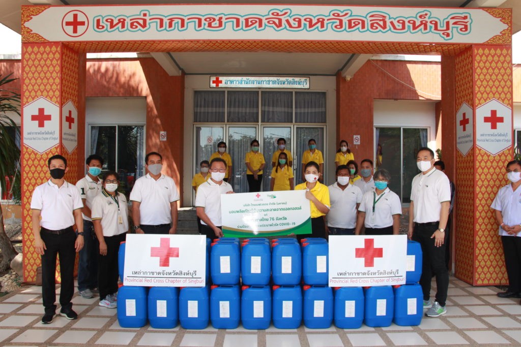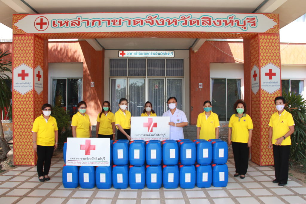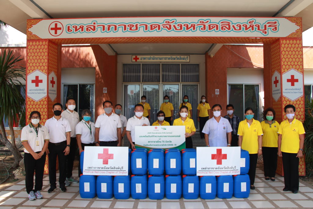 ผู้ช่วยนายกเหล่ากาชาดจังหวัด และกรรมการเหล่ากาชาดจังหวัดสิงห์บุรี รับมอบแอลกอฮอล์ จากบริษัทไทยเบฟเวอเรจ จำกัด (มหาชน) จำนวน 1,000 ลิตร ณ สำนักงาน