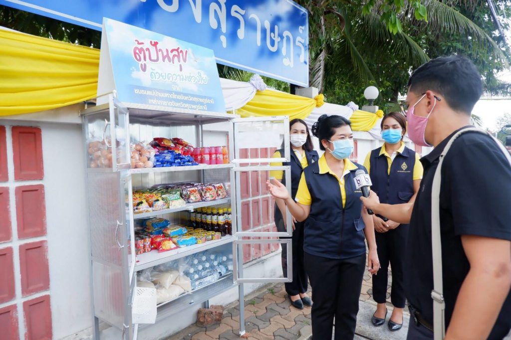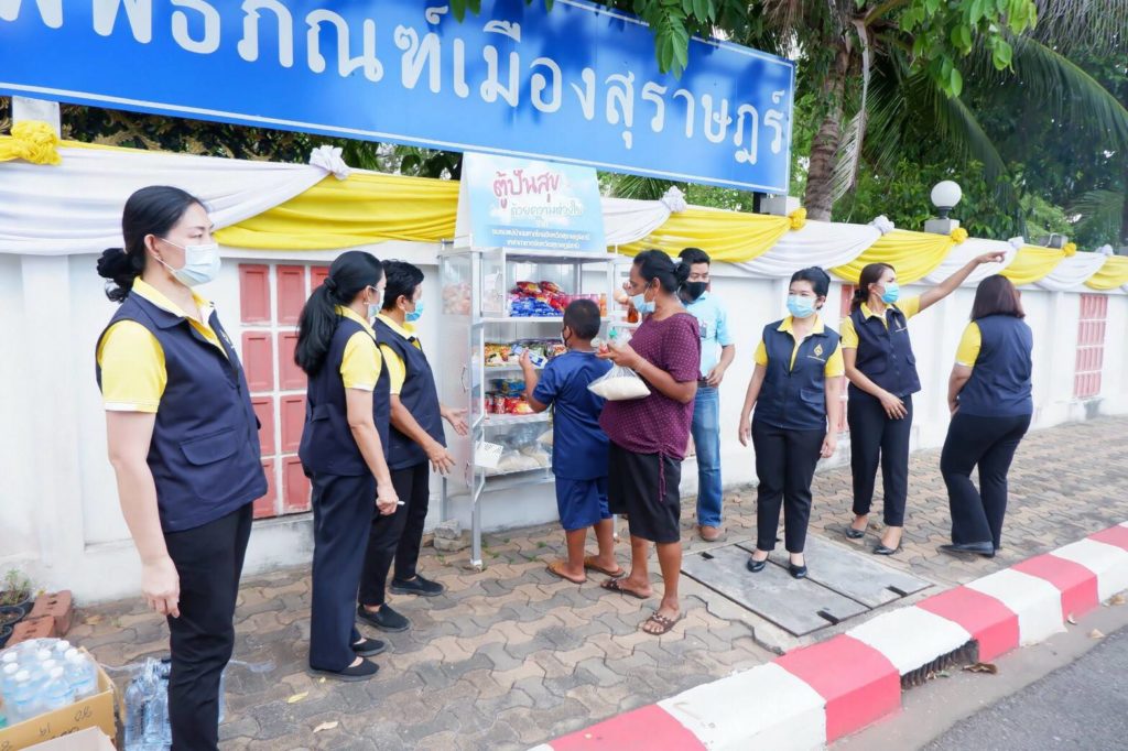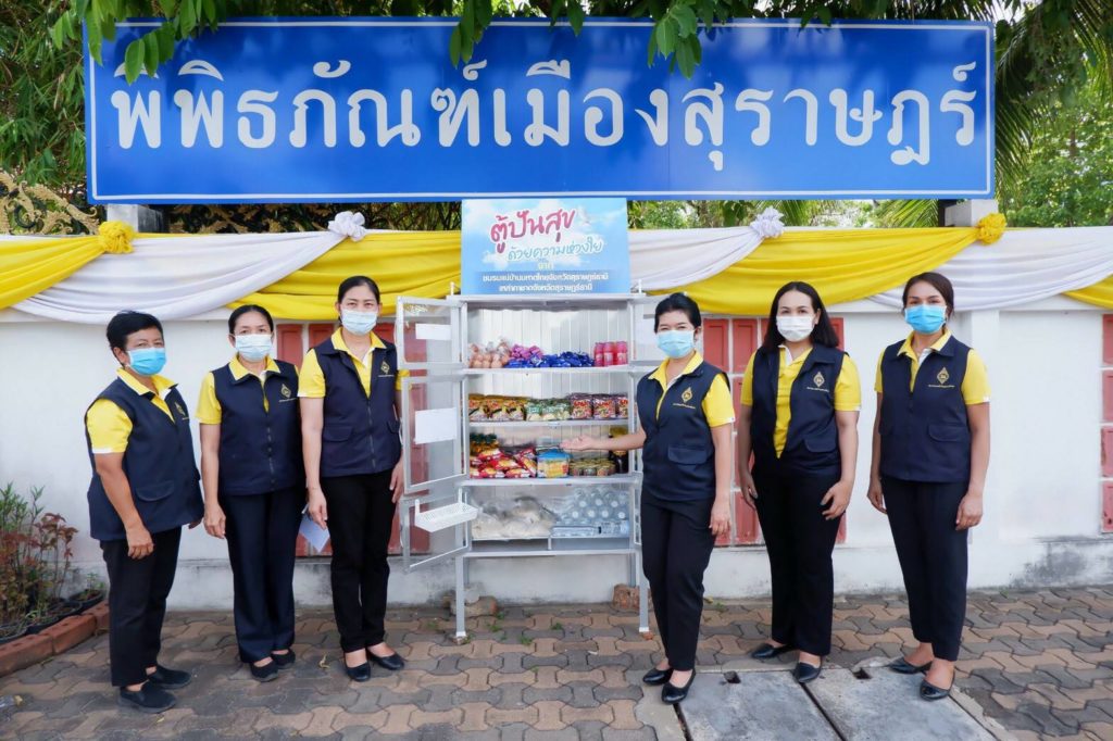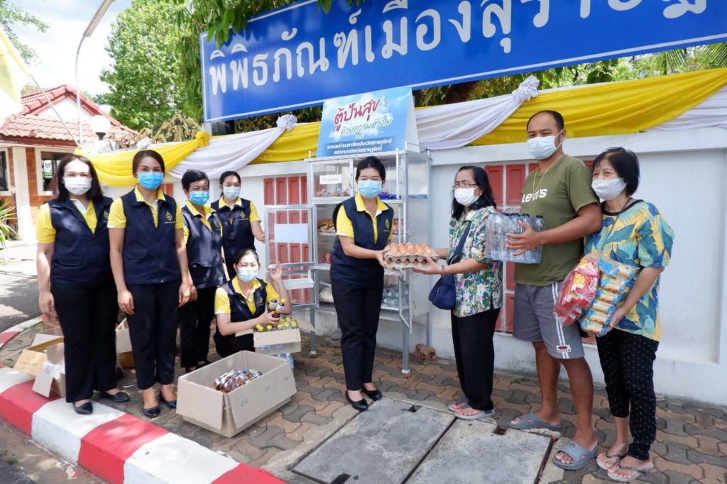 วันที่ 13 พฤษภาคม 2563 นางอุรสา จินโต ประธานแม่บ้านมหาดไทยจังหวัดสุราษฎร์ธานี นายกเหล่ากาชาดจังหวัดสุราษฎร์ธานี พร้อมด้วยสมาชิกชมรมแม่บ้านมหาดไทยจังหวัดสุราษฎร์ธานีร่วมกันจัดตั้ง “ตู้ปันสุข” และจัดเตรียมสิ่งของอาทิเช่น เครื่องอุปโภค บริโภค ข้าวสาร อาหารแห้ง ต่างๆ โดยนำไปใส่ไว้ในตู้ปันสุข ณ บริเวณหน้าจวนผู้ว่าราชการจังหวัดสุราษฎร์ธานี อำเภอเมือง จังหวัดสุราษฎร์ธานีล โดยเป็นความร่วมมือกันระหว่างชมรมแม่บ้านมหาดไทยจังหวัดสุราษฎร์ธานีร่วมกับเหล่ากาชาดจังหวัดสุราษฎร์ธานี ทั้งนี้ เพื่อให้ประชาชนชาวจังหวัดสุราษฎร์ธานีที่เดือดร้อนและได้รับผลกระทบจากการแพร่ระบาดจากเชื้อไวรัสโคโรนา 2019 (โควิด-19) ได้รับเครื่องอุปโภค