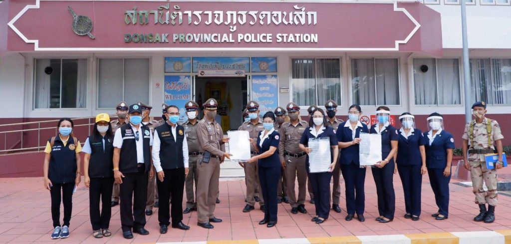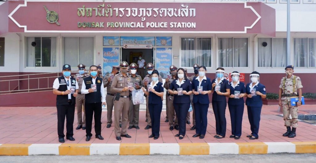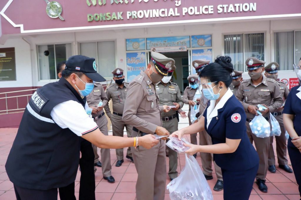 วันที่ 14 พฤษภาคม 2563 นางอุรสา จินโต นายกเหล่ากาชาดจังหวัดสุราษฎร์ธานี พร้อมด้วยที่ปรึกษาฯ และสมาชิกเหล่ากาชาดจังหวัดสุราษฎร์ธานีได้ไปมอบ Face Shield จำนวน 60 ชิ้น หน้ากากอนามัยแบบผ้า จำนวน 50 ชิ้น และเจลล้างมือ จำนวน 100 หลอด ให้แก่เจ้าหน้าที่ตำรวจ ณ สถานีตำรวจภูธรดอนสัก อำเภอดอนสัก จังหวัดสุราษฎร์ธานี โดยมี นายเจริญ เปลี่ยวจิตร นายอำเภอดอนสัก พ.ต.อ.สุทธิ นิติอัครพงศ์ ผู้กำกับการสถานีตำรวจภูธรดอนสัก นายชัชชัย มณี ปลัดอำเภอหัวหน้ากลุ่มงานบริหารงานปกครองอำเภอดอนสักนายไตรรัตน์ ขุนหลัด สาธารณสุขอำเภอดอนสักและข้าราชการตำรวจเป็นผู้รับมอบฯ