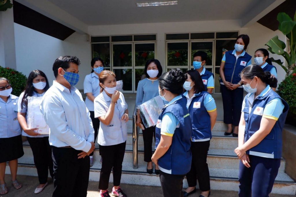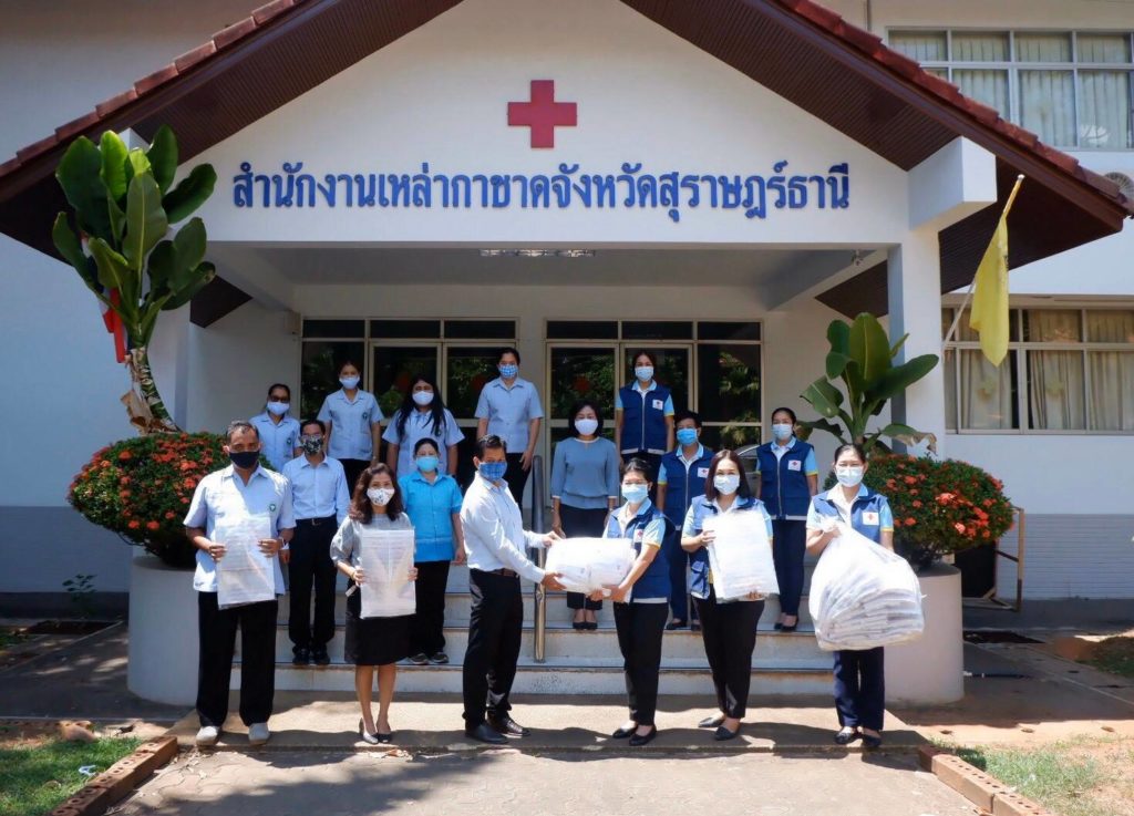 วันที่ 15 พฤษภาคม 2563 นางอุรสา จินโต นายกเหล่ากาชาดจังหวัดสุราษฎร์ธานี พร้อมด้วยที่ปรึกษาฯ และสมาชิกเหล่ากาชาดจังหวัดสุราษฎร์ธานีได้ร่วมมอบหน้ากากอนามัยแบบผ้าที่มีตราสัญลักษณ์ สภากาชาดไทย จำนวน 300 ชิ้นและ Face Shield จำนวน 300 ชิ้น ให้กับนายศรุตยา สุทธิรักษ์ เจ้าหน้าที่วิเคราะห์นโยบายและแผนชำนาญการพิเศษหัวหน้ากลุ่มงานพัฒนายุทธศาสตร์สาธารณสุขสำนักงานสาธารณสุขจังหวัดสุราษฎร์ธานี ณ สำนักงานเหล่ากาชาดจังหวัดสุราษฎร์ธานี อำเภอเมือง จังหวัดสุราษฎร์ธานี ในการนี้ สาธารณสุขจังหวัดสุราษฎร์ธานีจะนำไปเพื่อใช้สำหรับจัดกิจกรรมรณรงค์เสริมสร้างองค์ความรู้และกระตุ้นพฤติกรรม การป้องกันโรคไวรัสโควิด-19 โดยรูปเเบบ Flash Mob