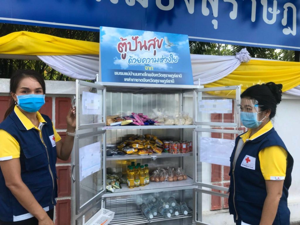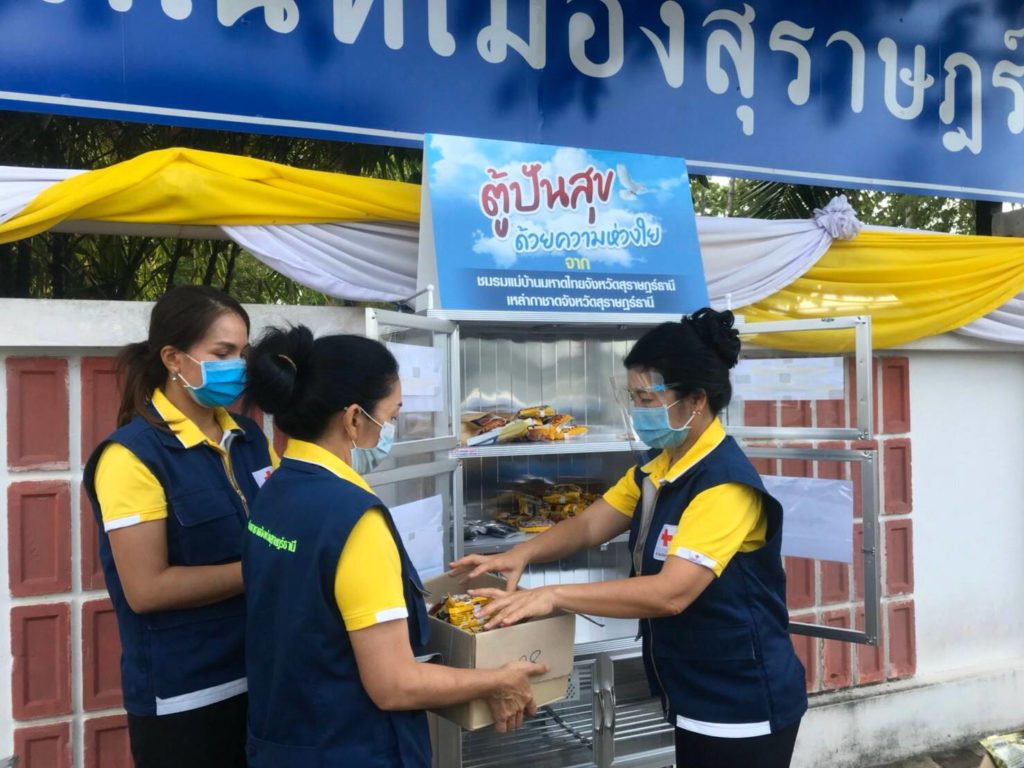 วันที่ 18 พฤษภาคม 2563 นางอุรสา จินโต นายกเหล่ากาชาดจังหวัดสุราษฎร์ธานี พร้อมด้วยที่ปรึกษาฯ และสมาชิกเหล่ากาชาดจังหวัดสุราษฎร์ธานีได้นำเครื่องอุปโภค บริโภค ข้าวสาร อาหารแห้ง ต่างๆ ใส่ในตู้ปันสุข ณ หน้าจวนผู้ว่าราชการจังหวัดสุราษฎร์ธานี อำเภอเมือง จังหวัดสุราษฎร์ธานี เป็นจำนวน 2 ครั้ง
