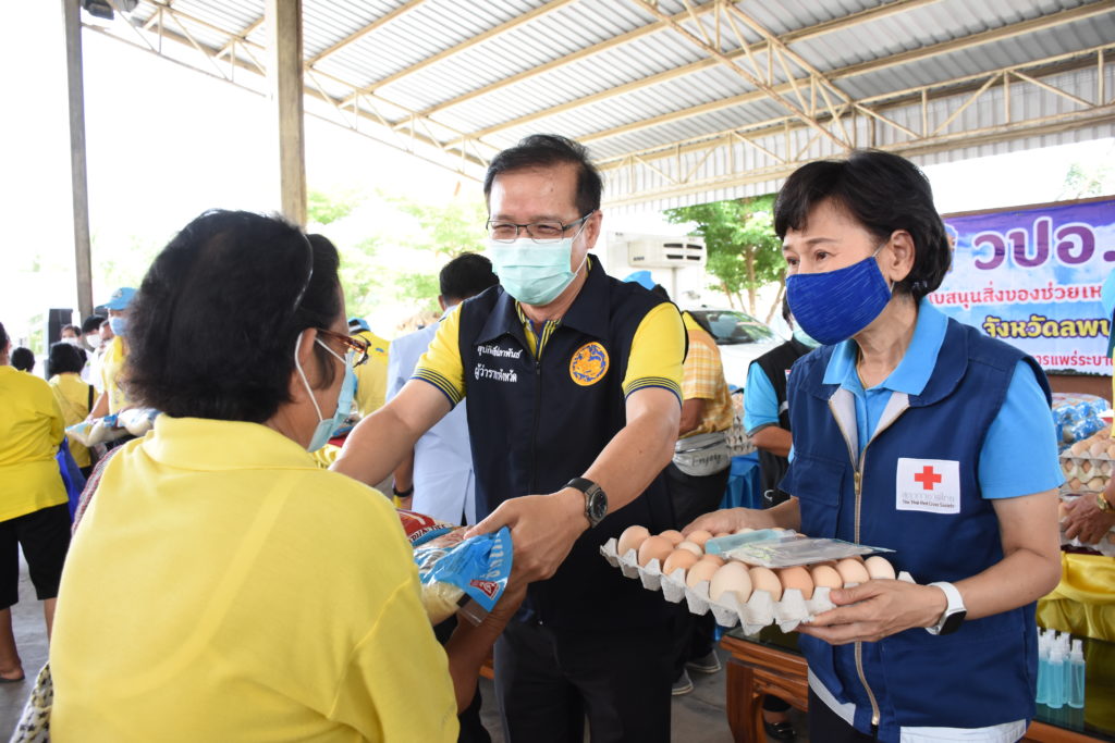 นางจุรีพร โพธิ์ปภาพันธ์ นายกเหล่ากาชาดจังหวัดลพบุรี และเจ้าหน้าที่บริษัทเบทาโกร รองนายกเหล่ากาชาดจังหวัดลพบุรี กรรมการเหล่ากาชาดจังหวัดลพบุรี นายอำเภอบ้านหมี่ กิ่งกาชาดอำเภอบ้านหมี่ ผู้นำชุมชนและหน่วยงานที่เกี่ยวข้อง ร่วมกันมอบสิ่งของจำเป็น ประกอบด้วย ข้าวสารถุงละ 5 กิโลกรัม, ไข่ไก่, แอลกอฮอล์, หน้ากากผ้า