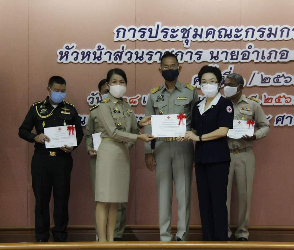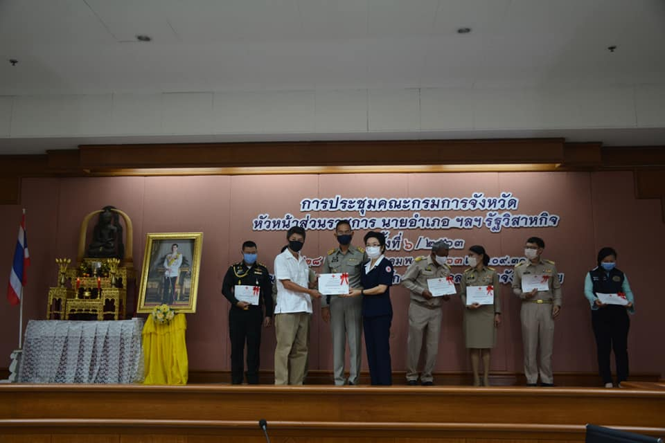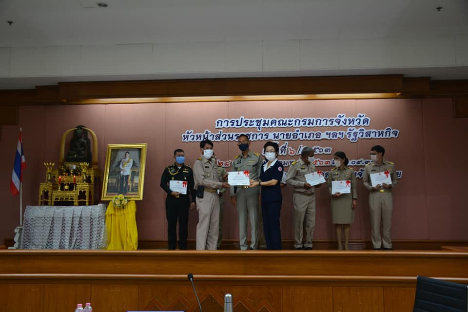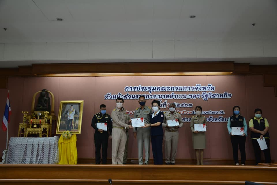 วันที่ 28 พฤษภาคม 2563 นายชัยวัฒน์ ชื่นโกสุม ผู้ว่าราชการจังหวัดเลย พร้อมด้วยนางกุลทรัพย์ ชื่นโกสุม นายกเหล่ากาชาดจังหวัดเลย มอบเกียรติบัตรให้แก่ผู้แทนหน่วยงาน