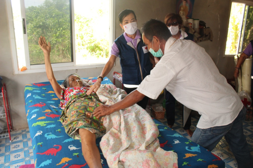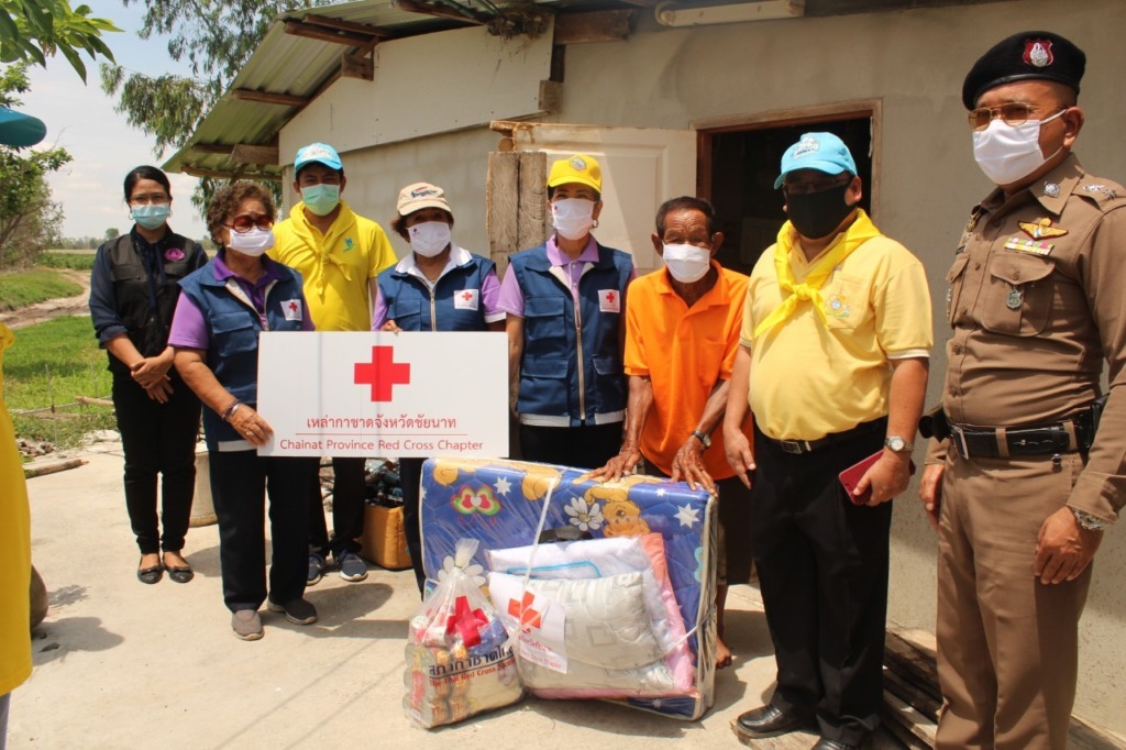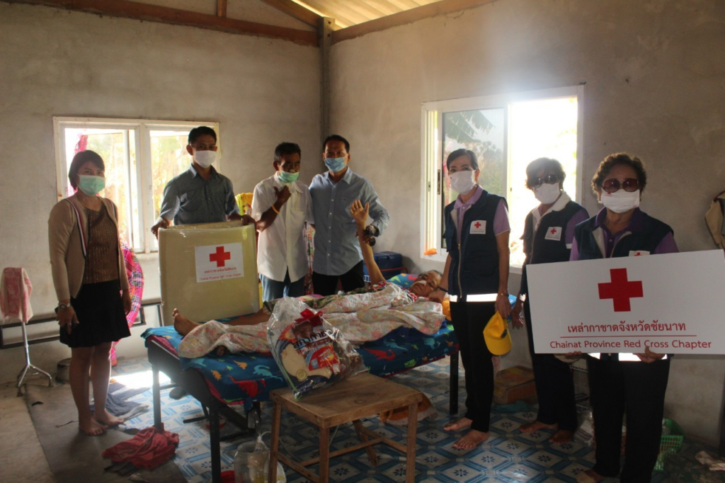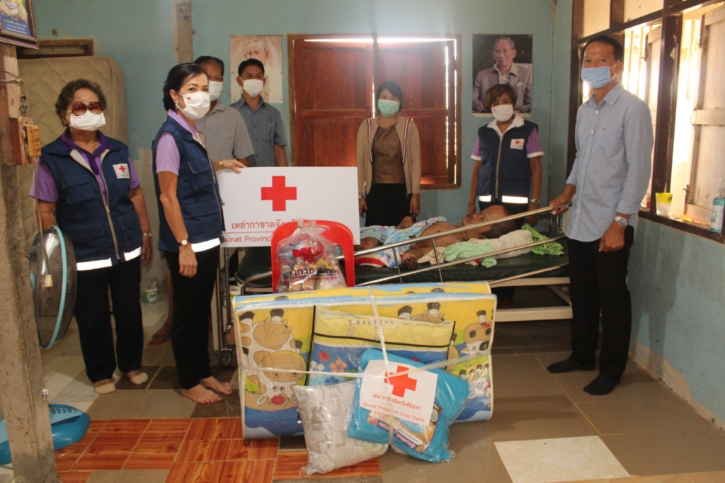 จังหวัดชัยนาท คณะกรรมการและสมาชิกเหล่ากาชาดจังหวัดชัยนาท ลงพื้นที่เยี่ยมผู้ป่วย ผู้พิการ ผู้ด้อยโอกาส และให้กำลังใจ พร้อมมอบถุงยังชีพ ชุดเครื่องนอน จำนวน