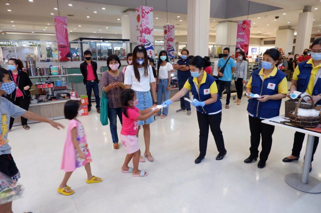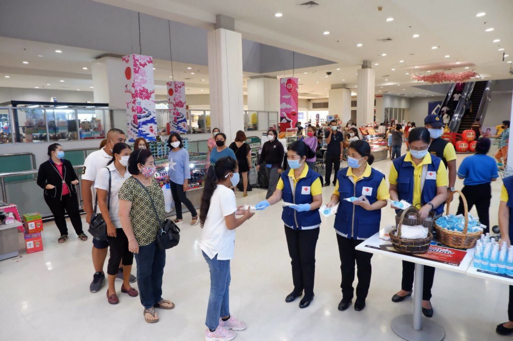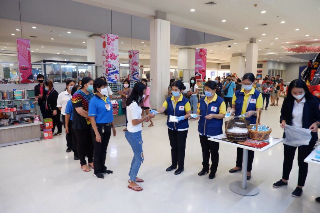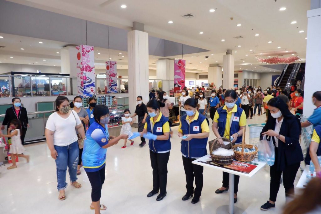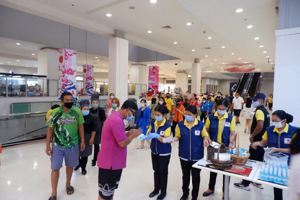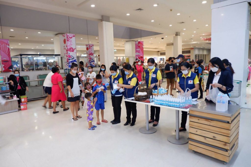 อนามัยแบบผ้าที่มีตราสัญลักษณ์ สภากาชาดไทย จำนวน 250 ชิ้น และแอลกอฮอล์ จำนวน 420 ขวด ให้กับประชาชนที่มาซื้อสินค้า ณ ศูนย์การค้าเทสโก้โลตัส
