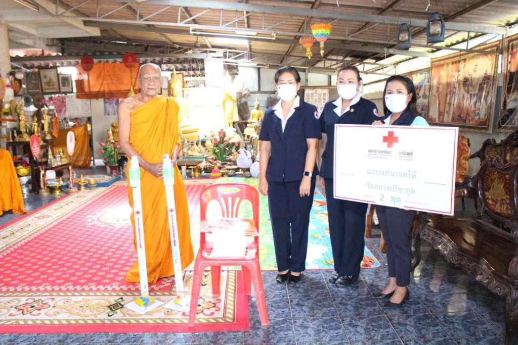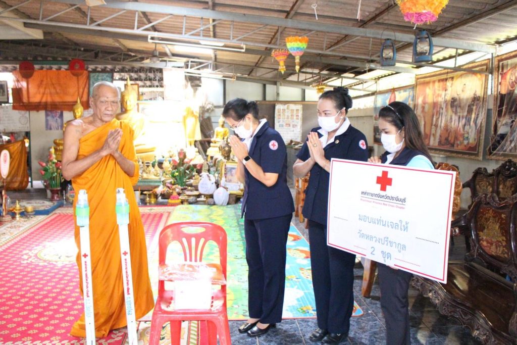 วันที่ 8 มิถุนายน 2563 วัดหลวงปรีชากูล อ.เมืองปราจีนบุรี นางอังคณา หัตถกิจโกศล นายกเหล่ากาชาดจังหวัดปราจีนบุรี พร้อมด้วยกรรมการและสมาชิกเหล่ากาชาดจังหวัดปราจีนบุรี ถวายแท่นกดเจลล้างมือชนิดเท้าเหยียบพร้อมขวดบรรจุ จำนวน 2 ชุด หน้ากากอนามัยแบบผ้า ตราสัญลักษณ์สภากาชาดไทย จำนวน 20 ชิ้น และหน้ากากอนามัย