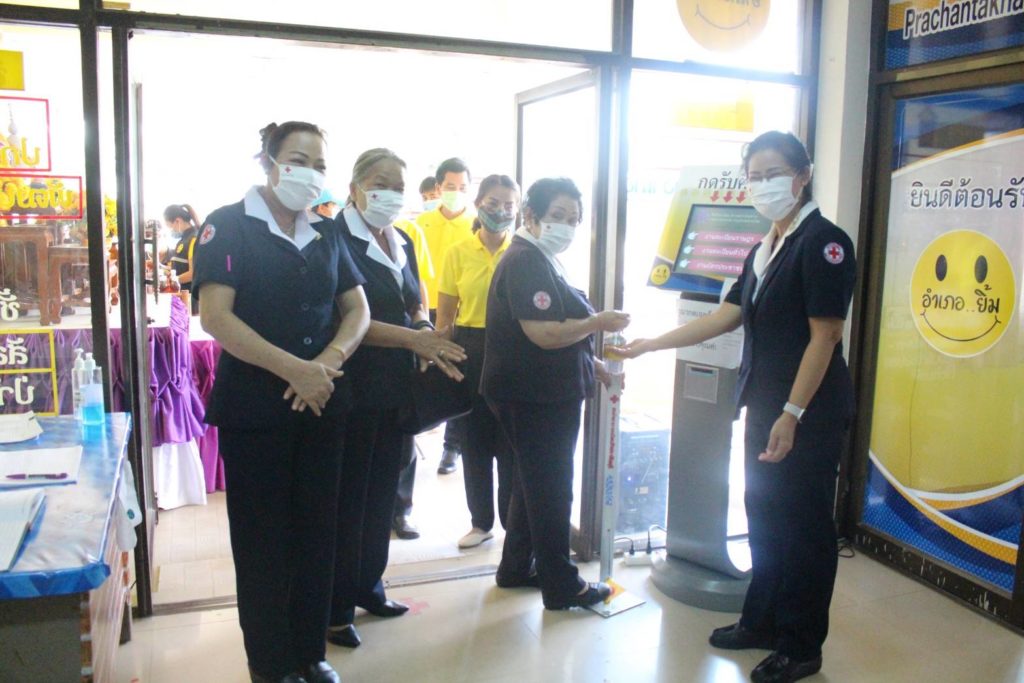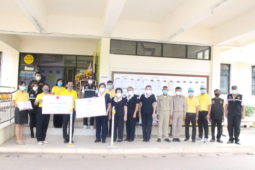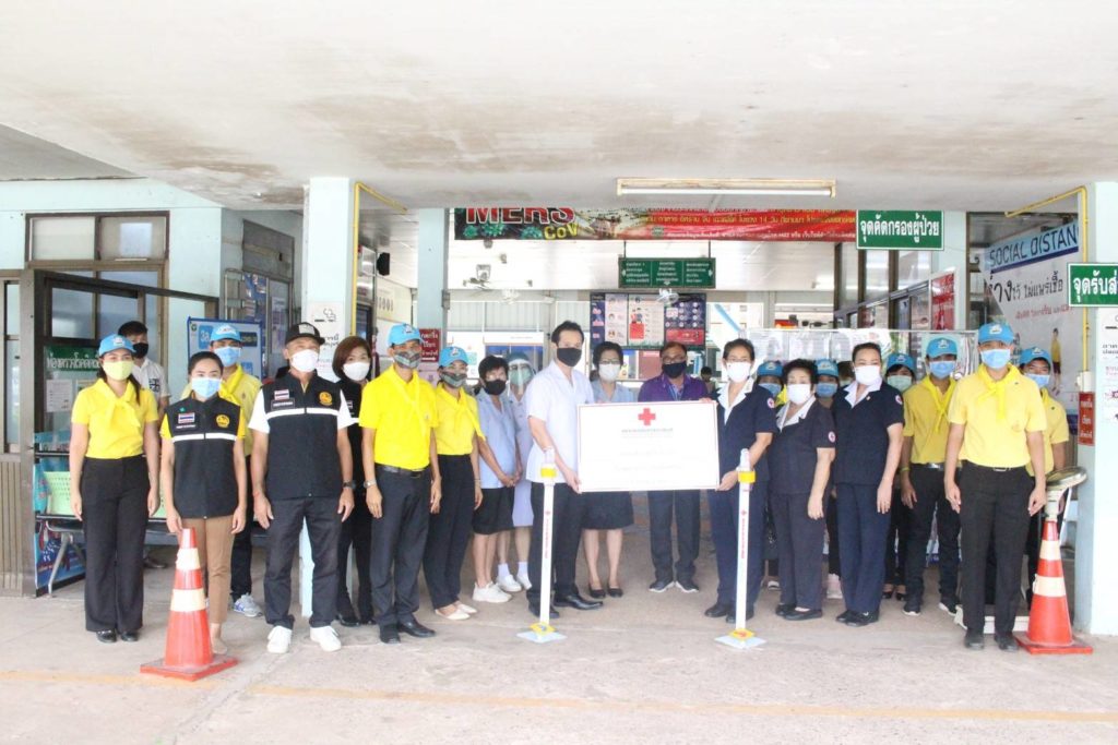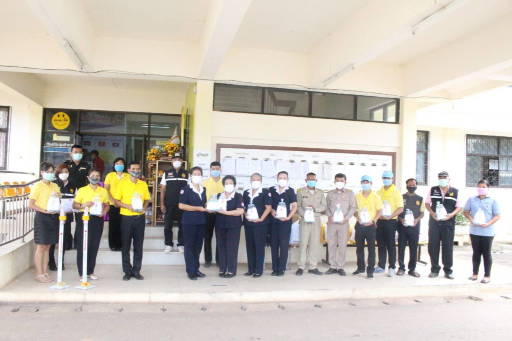 3.มอบ แท่นกดเจลล้างมือชนิดเท้าเหยียบพร้อมขวดบรรจุแอลกอฮอล์จำนวน 2 ชุด และหน้ากากอนามัยแบบผ้าตราสัญลักษณ์สภากาชาดไทยจำนวน 100 ชิ้น ให้แก่