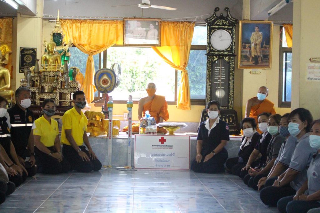 2.ถวายแท่นกดเจลล้างมือชนิดเท้าเหยียบพร้อมขวดบรรจุแอลกอฮอลล์ จำนวน 2 ชุด หน้ากากอนามัยแบบผ้า ตราสัญลักษณ์สภากาชาดไทย จำนวน 20 ชิ้น และหน้ากากอนามัยแบบผ้าสำหรับพระภิกษุของเหล่ากาชาดจังหวัดปราจีนบุรี จำนวน 50 ชิ้น เพื่อ ให้พระภิกษุ สามเณร และแม่ชีใช้ในการปฏิบัติศาสนกิจและป้องกันการแพร่ระบาด