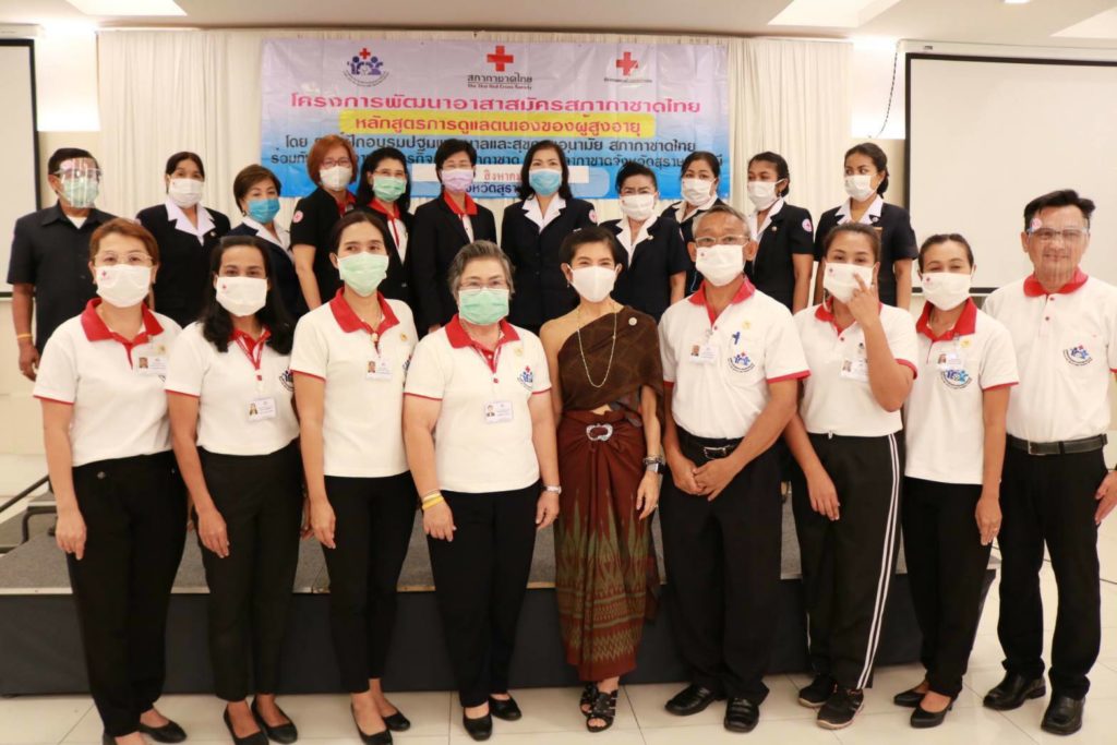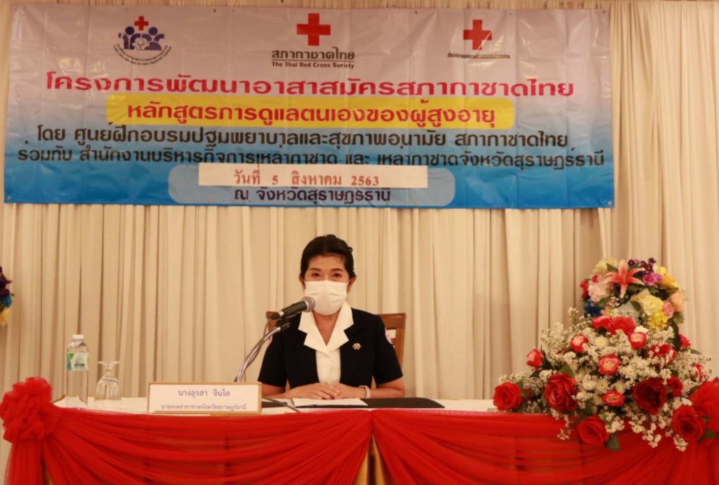 วันที่ 5 สิงหาคม 2563 นางอุรสา จินโต นายกเหล่ากาชาดจังหวัดสุราษฎร์ธานี เป็นประธานเปิดโครงการพัฒนาอาสาสมัครสภากาชาดไทย ” หลักสูตรการดูแลตนเองของผู้สูงอายุ “พร้อมด้วยที่ปรึกษาฯ กรรมการฯและสมาชิกเหล่ากาชาดจังหวัดสุราษฎร์ธานี ณ ห้องประชุ โรงแรมวังใต้อำเภอเมือง จังหวัดสุราษฎร์ธานี ในการนี้ นายกเหล่ากาชาดจังหวัดฯ