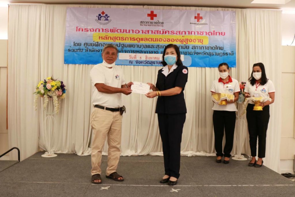 ได้มอบเข็มวิทยฐานะให้กับวิทยากรเครือข่ายประจำจังหวัดสุราษฎร์ธานีที่ได้ผ่านการอบรมหลักสูตรวิทยากรแกนนำประจำจังหวัดฯจากสภากาชาดไทย และ นำความรู้มาถ่ายทอดแก่จิตอาสาสภากาชาดไทย สู่การเป็นอาสาสมัครสภากาชาดไทยในจังหวัดสุราษฎร์ธานี จำนวน 6 ท่าน พร้อมนี้ เหล่ากาชาดจังหวัดสุราษฎร์ธานีได้มอบหน้ากากอนามัยแบบผ้าที่มีตราสัญลักษณ์ สภากาชาดไทยให้กับโรงพยาบาล 3 โรงพยาบาล ได้แก่ โรงพยาบาลท่าโรงช้างโรงพยาบาลคีรีรัฐนิคม และโรงพยาบาลพุนพินโรงพยาบาล