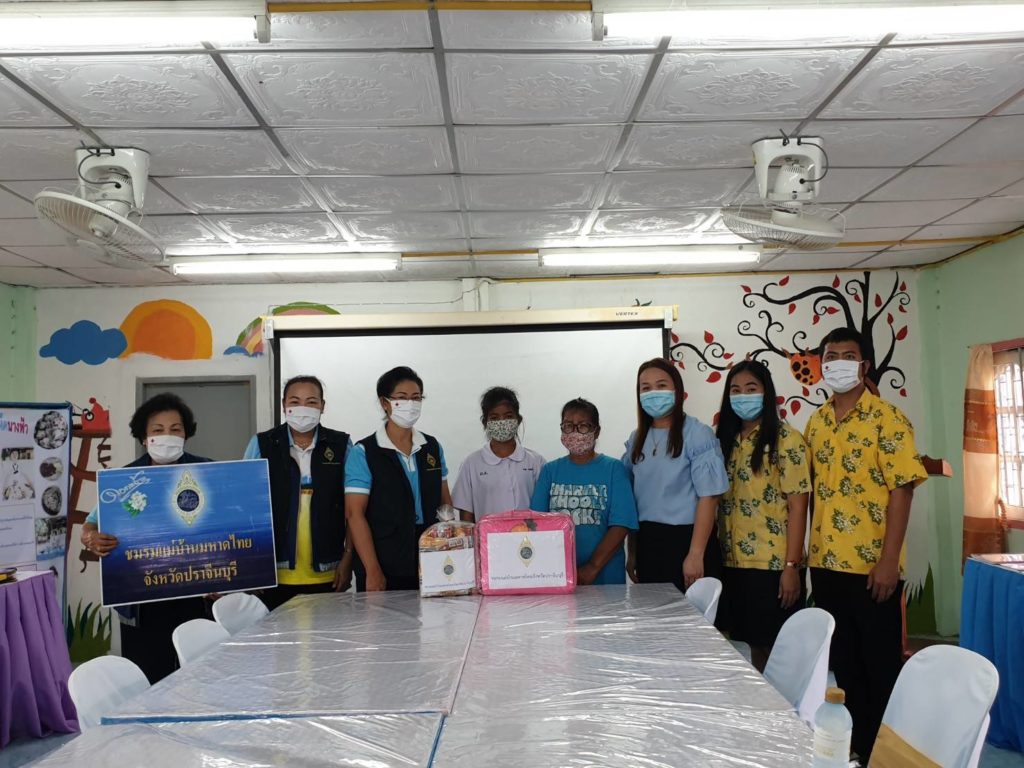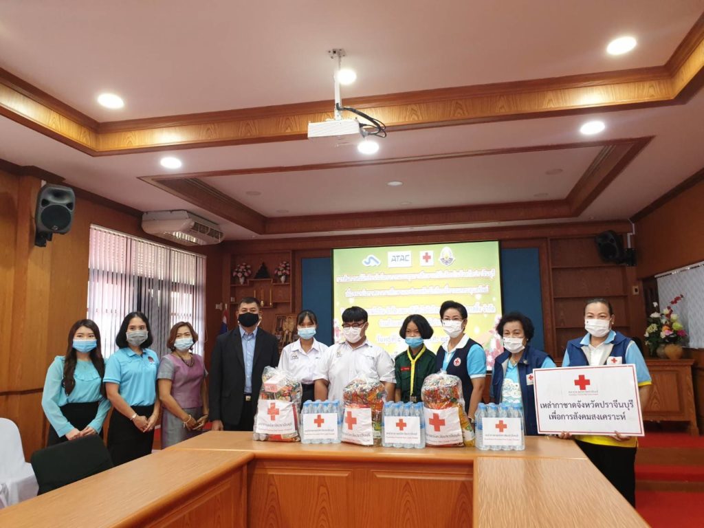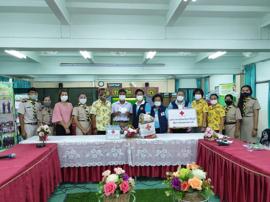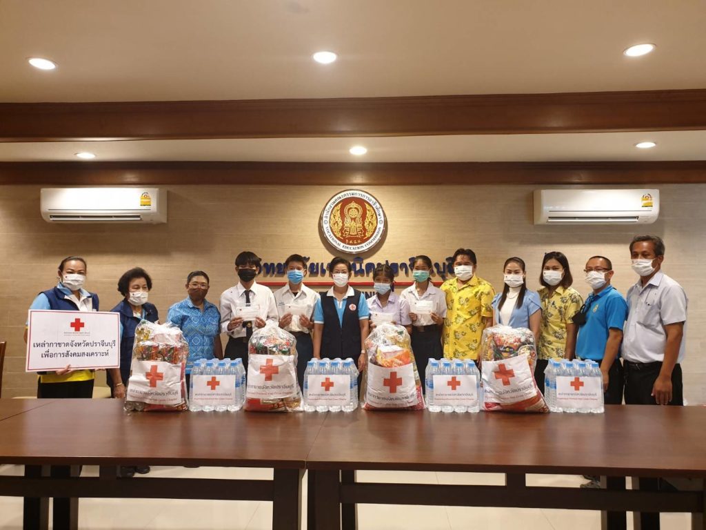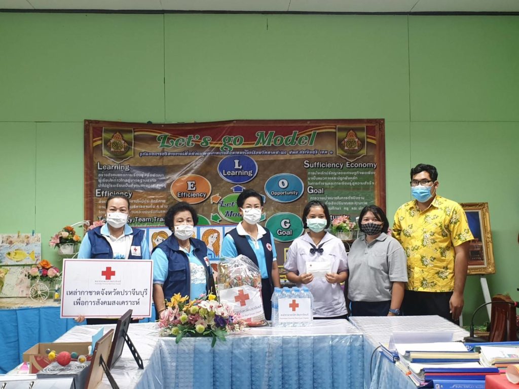 โดยเหล่ากาชาดจังหวัดปราจีนบุรี มอบหน้ากากอนามัยแบบผ้าตราสัญลักษณ์สภากาชาดไทย รายละ 5 ชิ้น เครื่องอุปโภคบริโภครายละ 1 ชุด และน้ำรายละ 1 แพ็ค เพื่อเป็นการช่วยเหลือตามพันธกิจด้านการสังคมสงเคราะห์ต่อไป