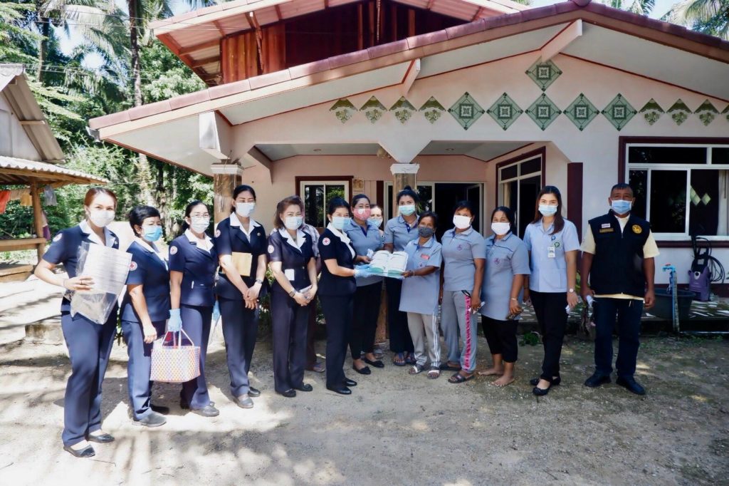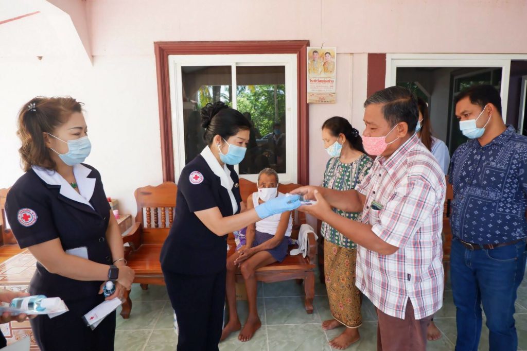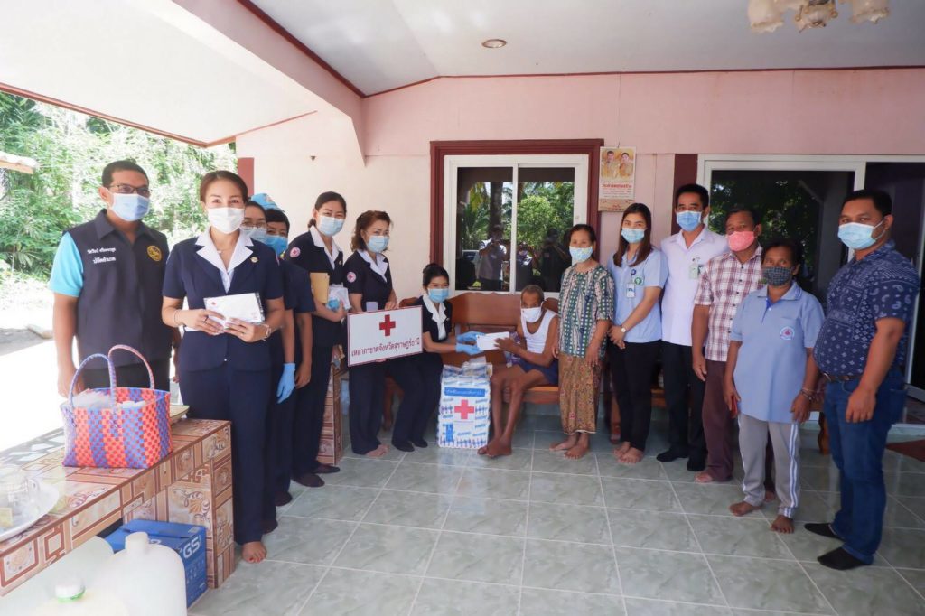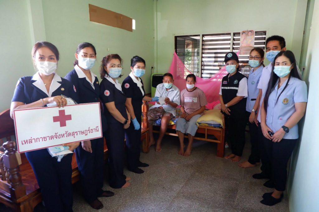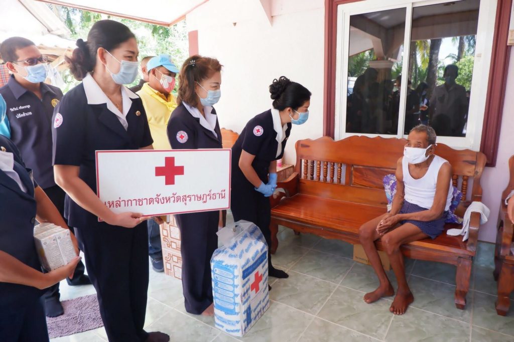 ในการนี้ เหล่ากาชาดจังหวัดสุราษฎร์ธานีได้มอบเงิน ให้รายละ 3,000 บาท เพื่อเป็นขวัญกำลังใจและบรรเทาทุกข์ในเบื้องต้นด้วย พร้อมกันนี้ นายกเหล่ากาชาดจังหวัดสุราษฎร์ธานีได้แจกหน้ากากอนามัยแบบผ้าที่มีตราสัญลักษณ์ สภากาชาดไทยFace Shield และแอลกอฮอล์ล้างมือให้กับประชาชนและ อสม. ในพื้นที่ เพื่อป้องกันการแพร่ระบาดของเชื้อไวรัสโคโรนา 2019 ด้วย