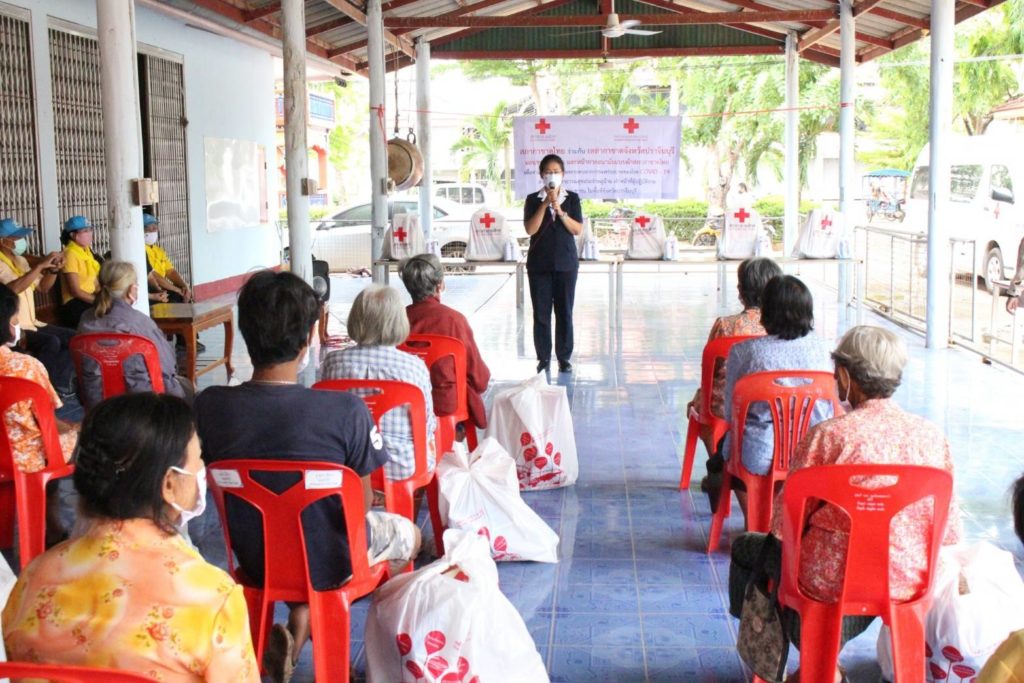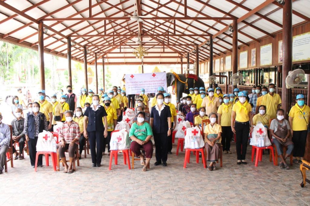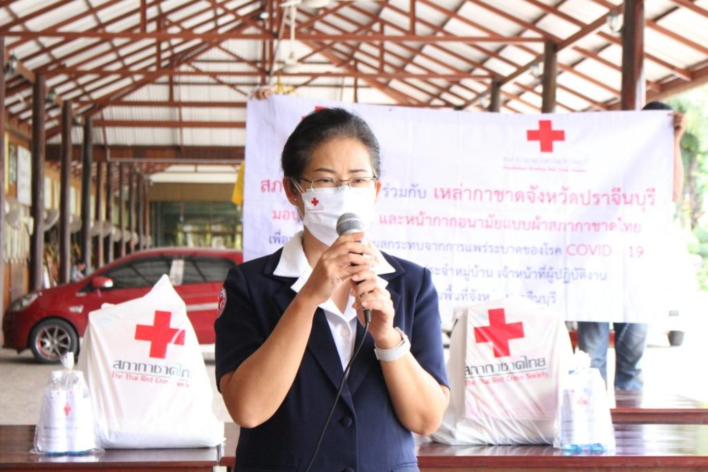 ให้รายละ 1 ชุด มอบชุดกาชาดห่วงใย ป้องกันโควิด – 19 (ผลิตภัณฑ์แอลกอฮอลล์ทำความสะอาด หน้ากากอนามัยแบบผ้าตราสัญลักษณ์สภากาชาดไทย และหน้ากากอนามัยแบบผ้าของเหล่ากาชาดจังหวัดปราจีนบุรี) ให้รายละ 1 ชุด เพื่อบรรเทาทุกข์ในเบื้องต้น