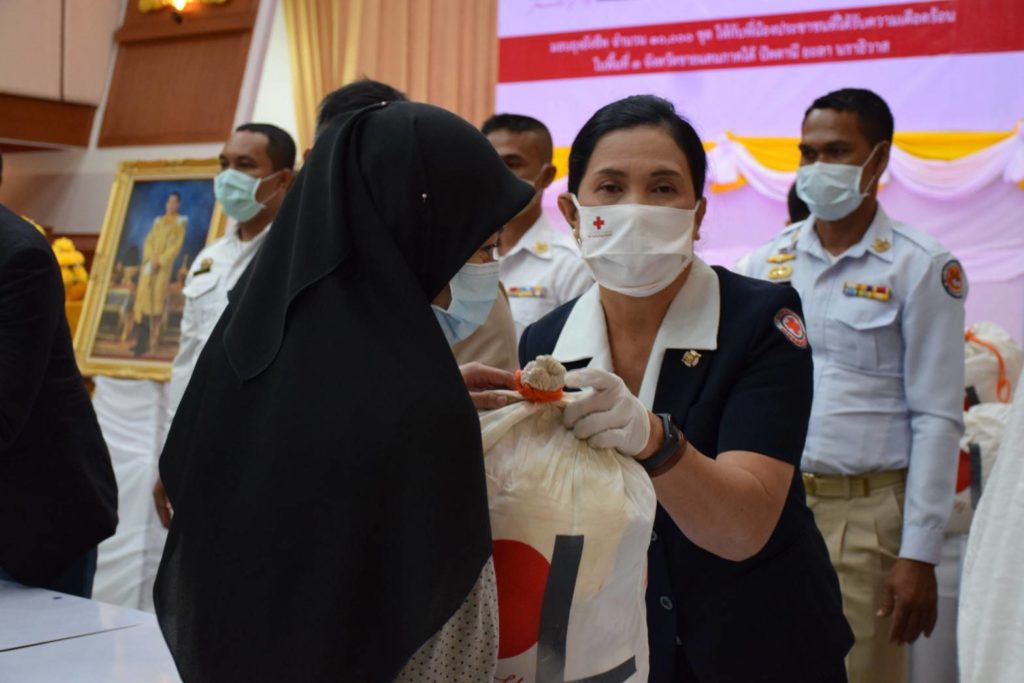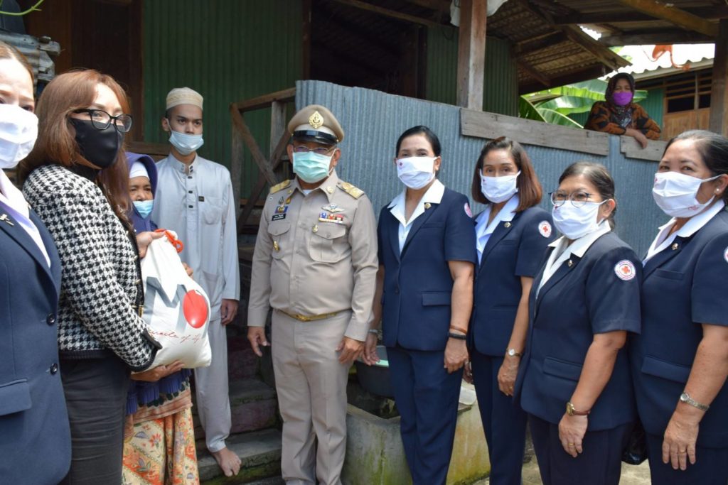 ในการนี้ นายกเหล่ากาชาดจังหวัดปัตตานี และคณะ ได้มอบหน้ากากอนามัยแบบผ้า ตามโครงการจัดหาผ้าฝ้ายมัสลินที่มีตราสัญลักษณ์สภากาชาดไทย “โครงการสภากาชาดไทย ร่วมใจป้องกันภัย COVID-19 ด้วยหน้ากากอนามัยแบบผ้า” ป้องกันการแพร่ระบาดของเชื้อไวรัสโคโรนา Coronavirus (COVID-19) ตามรูปแบบที่สภากาชาดไทยกำหนด จำนวน 120 ชิ้น แก่ประชาชนผู้ได้รับผลกระทบจากการแพร่ระบาดของโรคติดเชื้อไวรัสโคโรนา 2019 (COVID-19) ในพื้นที่จังหวัดปัตตานี หลังจากนั้น ได้เดินทางไปที่ชุมชนบ่อโอน ในเขตเทศบาลเมืองปัตตานี เพื่อมอบถุงยังชีพแก่ผู้ป่วยติดเตียง จำนวน 3 ราย
