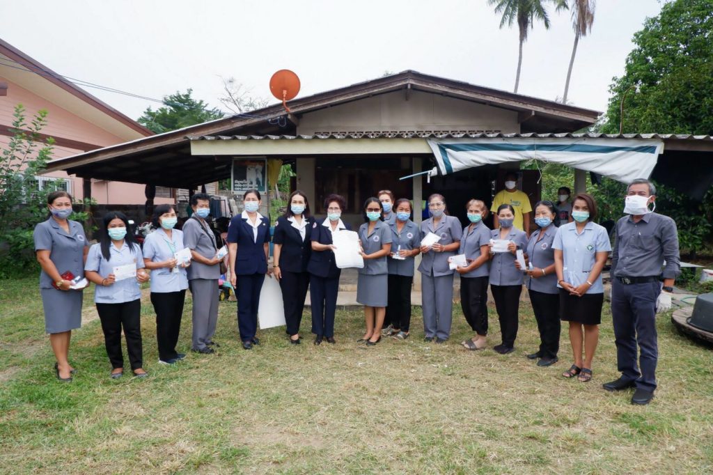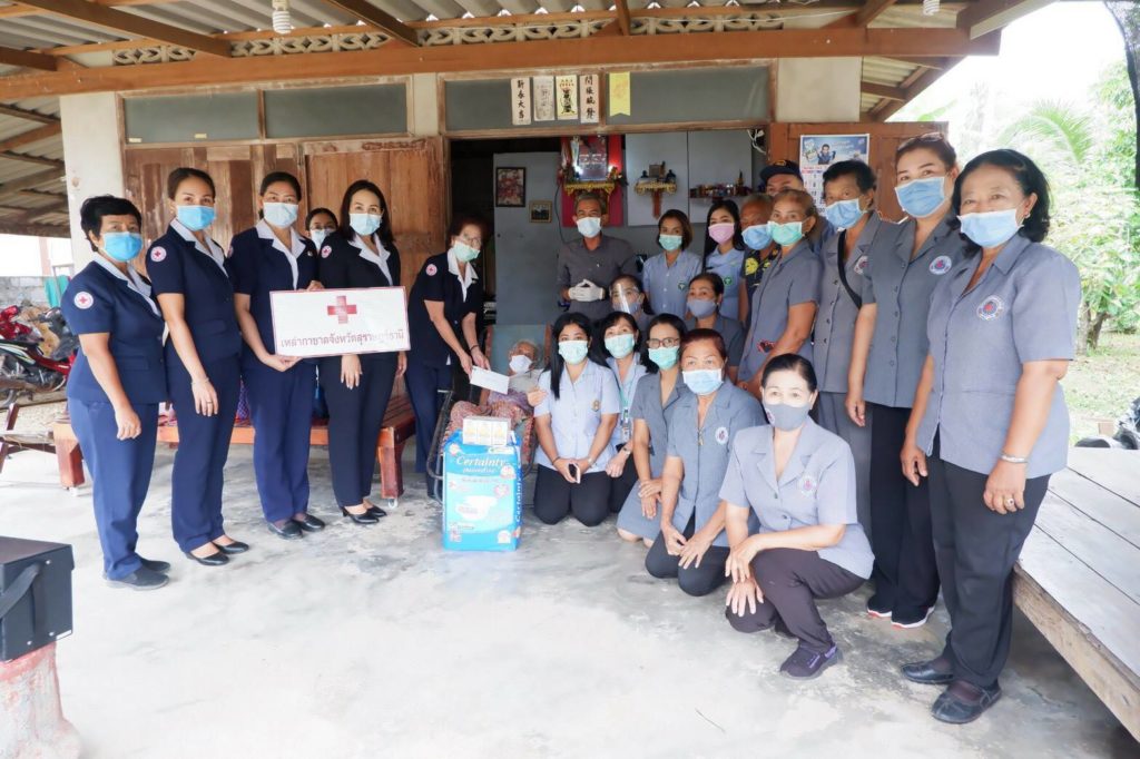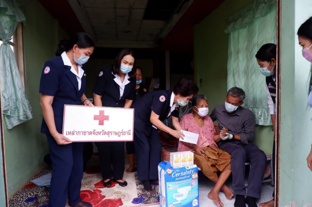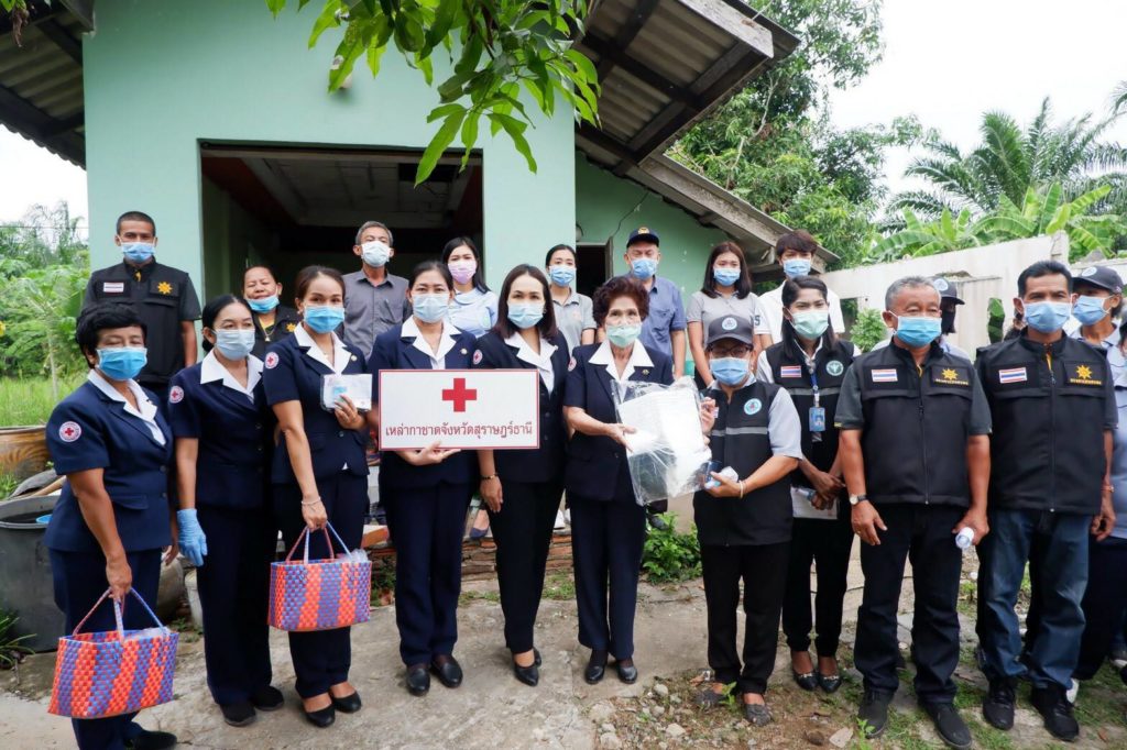 ในการนี้ เหล่ากาชาดจังหวัดสุราษฎร์ธานีได้มอบผ้าอ้อมสำเร็จรูป และนมถั่วเหลือง ให้รายละ 1 แพ็ค พร้อมมอบเงินให้รายละ 3,000 บาท เพื่อเป็นขวัญกำลังใจและบรรเทาทุกข์ในเบื้องต้นด้วย พร้อมกันนี้ เหล่ากาชาดจังหวัดสุราษฎร์ธานีได้แจกหน้ากากอนามัยแบบผ้าที่มีตราสัญลักษณ์ สภากาชาดไทย Face Shield และแอลกอฮอล์ล้างมือให้กับประชาชนและ อสม. ในพื้นที่เพื่อป้องกันการแพร่ระบาดของเชื้อไวรัสโคโรนา 2019 ด้วย