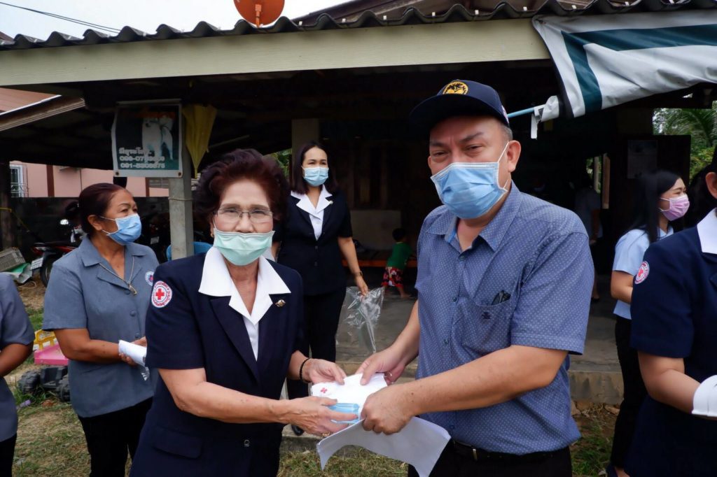 วันที่ 25 มิถุนายน 2563 นางอุรสา จินโต นายกเหล่ากาชาดจังหวัดสุราษฎร์ธานี มอบหมายให้นางประภา มณีวัต กรรมการเหล่ากาชาดจังหวัดสุราษฎร์ธานี พร้อมด้วยที่ปรึกษาฯ และสมาชิกเหล่ากาชาดจังหวัดสุราษฎร์ธานี นายพิทักษ์ โพธิรัตน์ ปลัดอำเภอหัวหน้ากลุ่มงานบริหารงานปกครองอำเภอกาญจนดิษฐ์เจ้าหน้าที่สาธารณสุข อสม. กำนัน