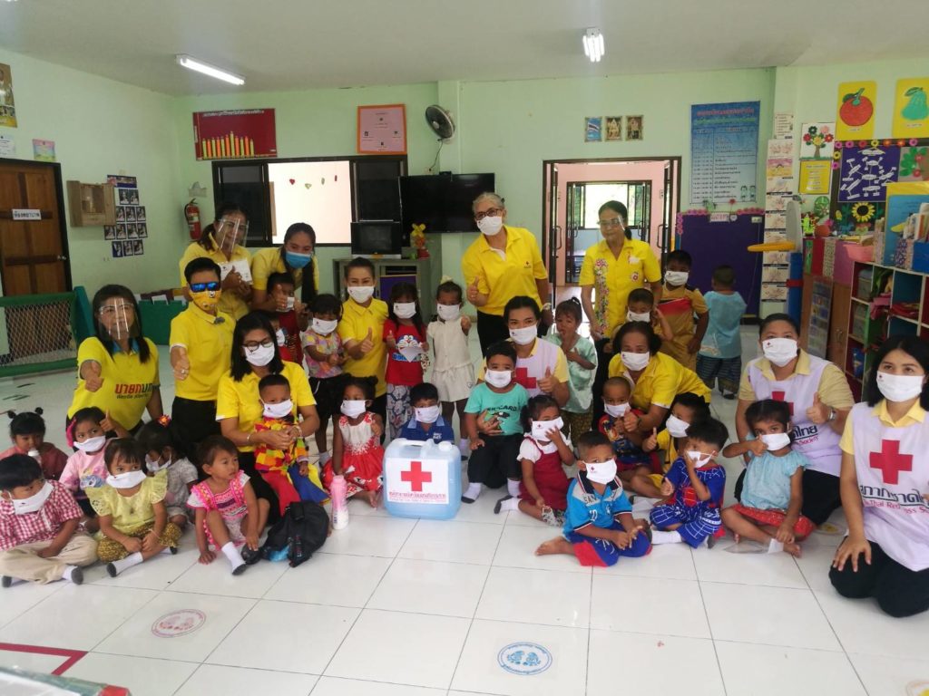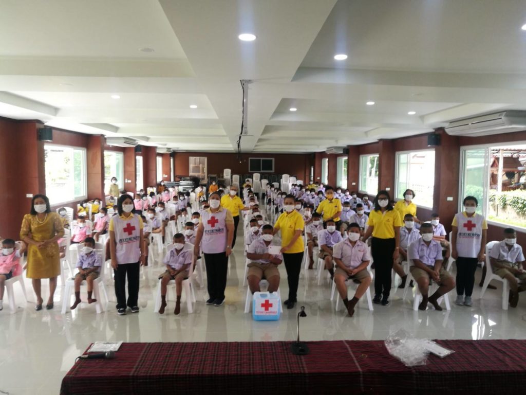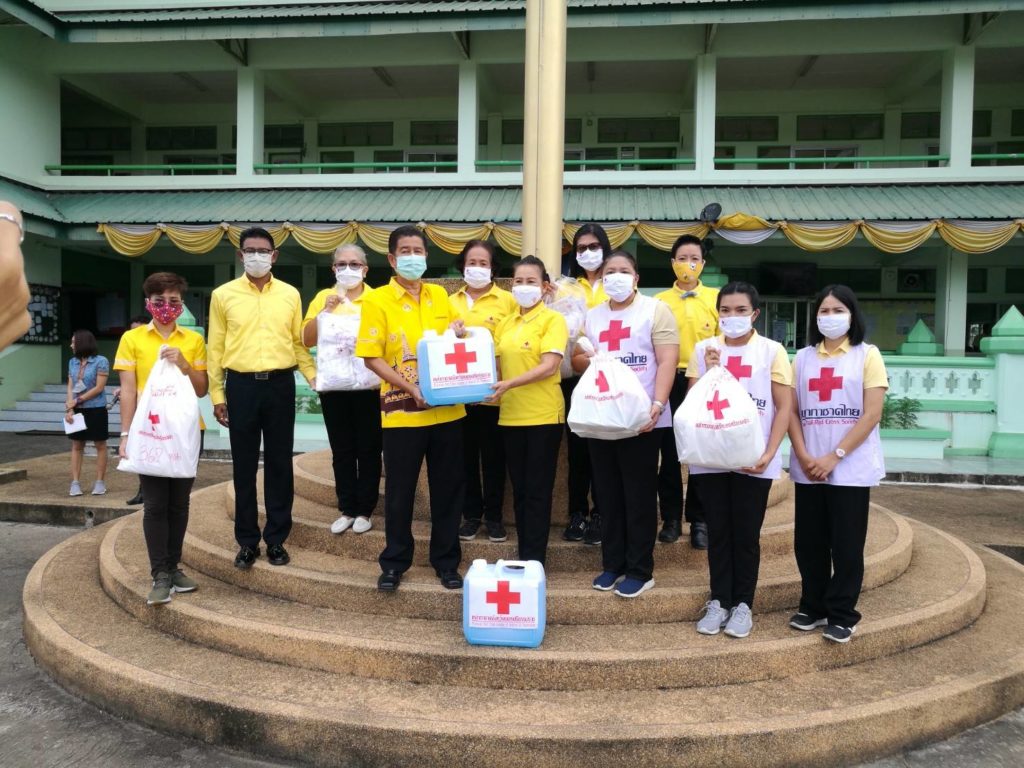 ที่มีตราสัญลักษณ์สภากาชาดไทย ที่ได้รับการสนับสนุนจากสำนักงานบรรเทาทุกข์และประชานามัยพิทักษ์ สภากาชาดไทย มอบให้แก่นักเรียนโรงเรียนกีฬาจังหวัดนครศรีธรรมราช จำนวน 380 คนๆละ 2 ชิ้น นักเรียนโรงเรียนบ้านคลองขุด จำนวน 125 คน ๆละ 2 ชิ้น นักเรียนศูนย์พัฒนาเด็กเล็กบ้านควนไม้แดง จำนวน 35 คน ๆละ 2 ชิ้น และนักเรียนศูนย์พัฒนาเด็กเล็กบ้านนาป่า จำนวน 30 คน ๆละ 2 ชิ้น รวมทั้งสิ้นจำนวน 1,140 ชิ้น เพื่อป้องกันการแพร่ระบาดของเชื้อโรคโคโรนา 2019 ณ พื้นที่อำเภอทุ่งสง จังหวัดนครศรีธรรมราช พร้อมด้วยมอบแอลกอฮอล์ให้กับโรงเรียนกีฬาจังหวัดนครศรีธรรมราช จำนวน 2 แกลอน,โรงเรียนบ้านคลองขุด จำนวน 1 แกลลอน,ศูนย์พัฒนาเด็กเล็กบ้านควนไม้แดง จำนวน 1 แกลลอน สำหรับคนพิการทางการทางร่างกายและศูนย์พัฒนาเด็กบ้านนาป่า จำนวน 1 แกลลอน