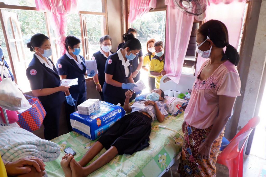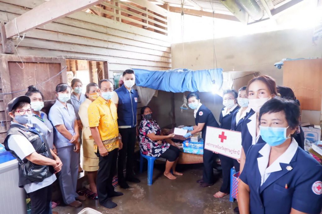 พร้อมกันนี้ เหล่ากาชาดจังหวัดสุราษฎร์ธานีได้เเจกหน้ากากอนามัยแบบผ้าที่มีตราสัญลักษณ์ สภากาชาดไทยให้กับประชาชน และ อสม. ในพื้นที่เพื่อป้องกันการ