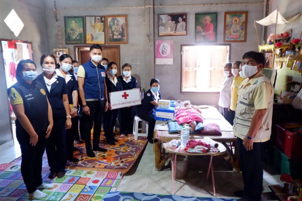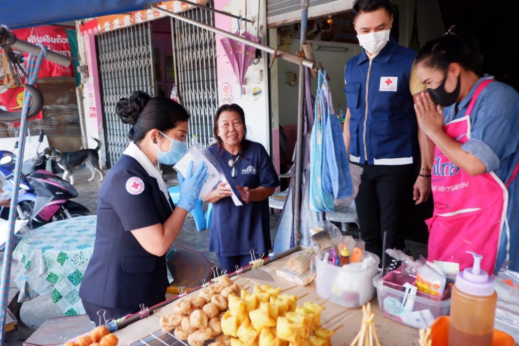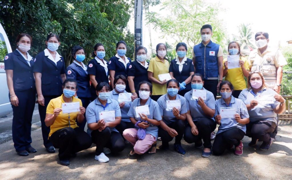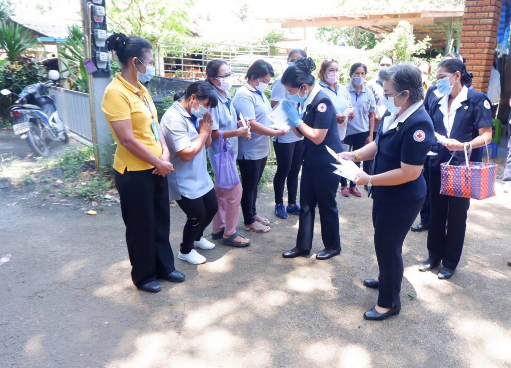 พร้อมกันนี้ เหล่ากาชาดจังหวัดสุราษฎร์ธานีได้เเจกหน้ากากอนามัยแบบผ้าที่มีตราสัญลักษณ์ สภากาชาดไทยให้กับประชาชน และ อสม. ในพื้นที่เพื่อป้องกันการแพร่ระบาดของเชื้อไวรัสโคโรนา 2019 ด้วย