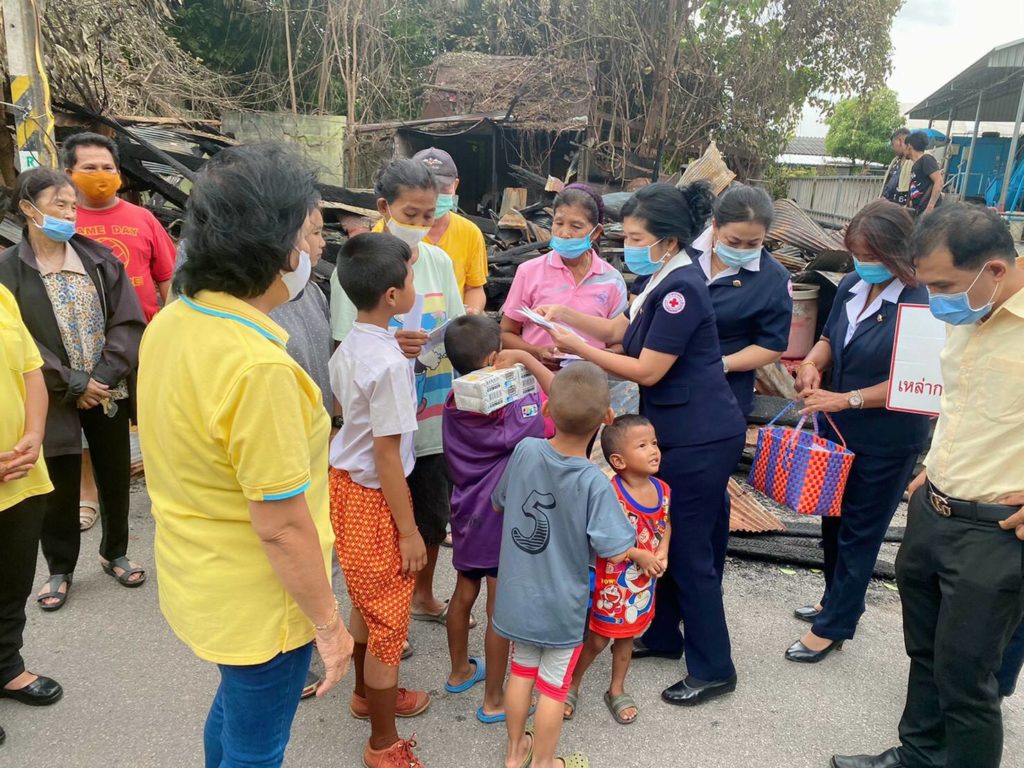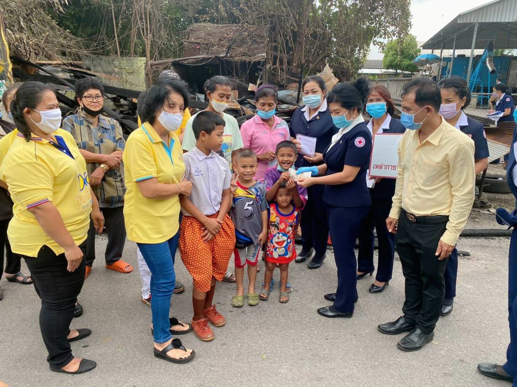และบรรเทาทุกข์ในเบื้องต้นและได้มอบหน้ากากอนามัยแบบผ้าที่มีตราสัญลักษณ์ สภากาชาดไทยให้แก่ประชาชนในพื้นที่ เพื่อใช้ในการป้องกันการแพร่ระบาดของเชื้อไวรัสโคโรนา 2019 ด้วย