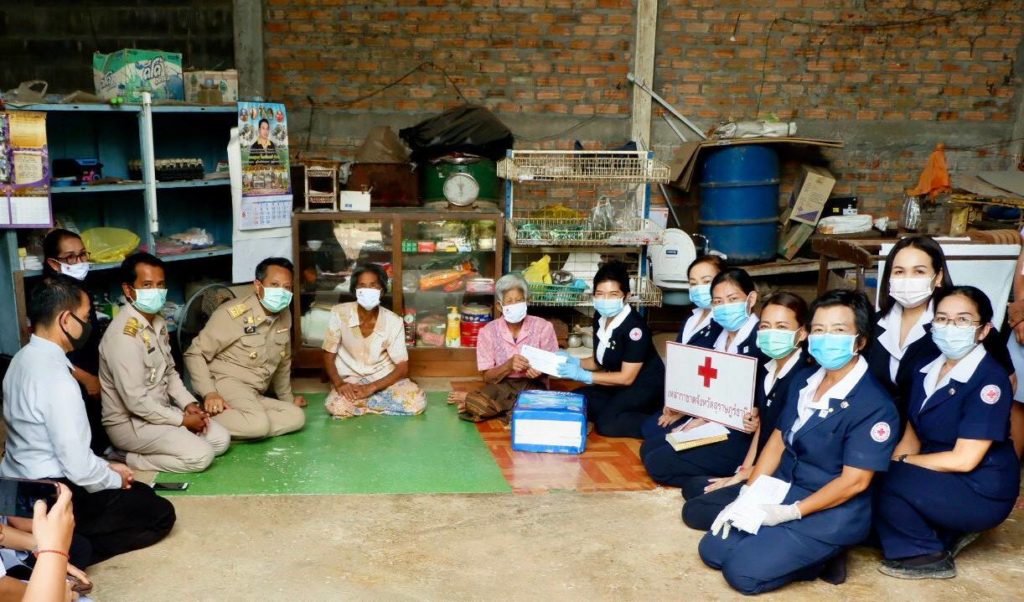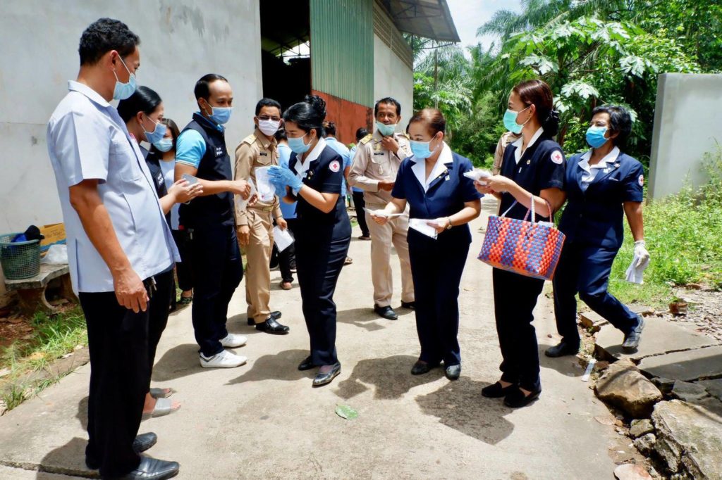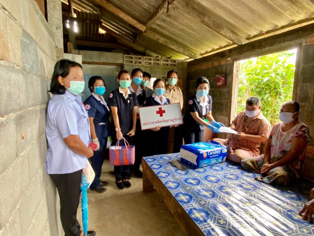 ในเบื้องต้นด้วยพร้อมกันนี้ เหล่ากาชาดจังหวัดสุราษฎร์ธานีได้เเจกหน้ากากอนามัยแบบผ้าที่มีตราสัญลักษณ์ สภากาชาดไทยให้กับประชาชนและ อสม. ในพื้นที่เพื่อป้องกัน