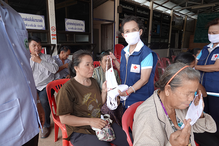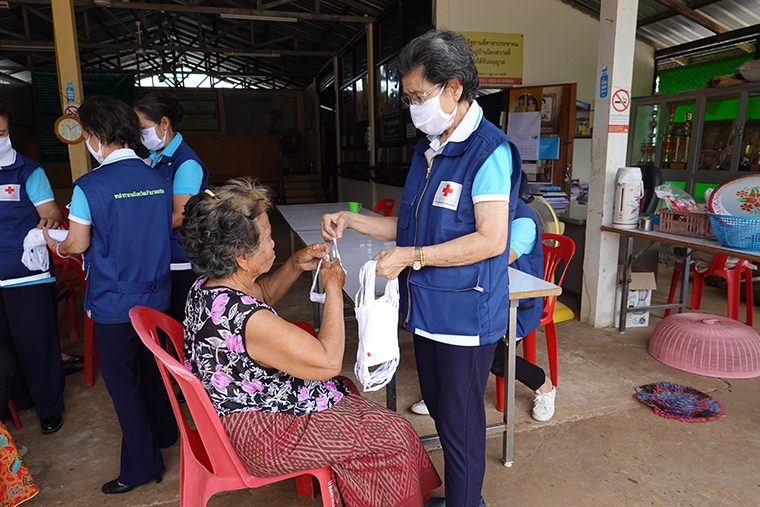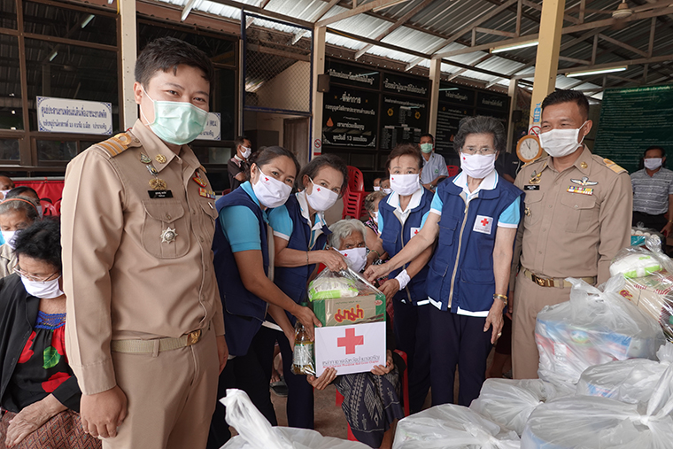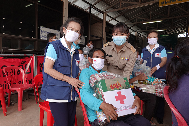 บริโภค จำนวน 29 ชุด พร้อมทั้งมอบหน้ากากอนามัยที่มีตราสัญลักษณ์สภากาชาดไทย ให้กับผู้ประสบภัยเพื่อเป็นการสร้างขวัญให้กำลังใจในเบื้องต้น