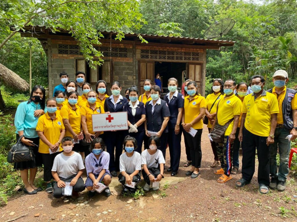 ในเบื้องต้นด้วย พร้อมกันนี้ เหล่ากาชาดจังหวัดสุราษฎร์ธานีได้เเจกหน้ากากอนามัยแบบผ้าที่มีตราสัญลักษณ์ สภากาชาดไทยให้กับประชาชนและ อสม. ในพื้นที่เพื่อป้องกัน
