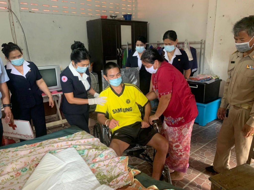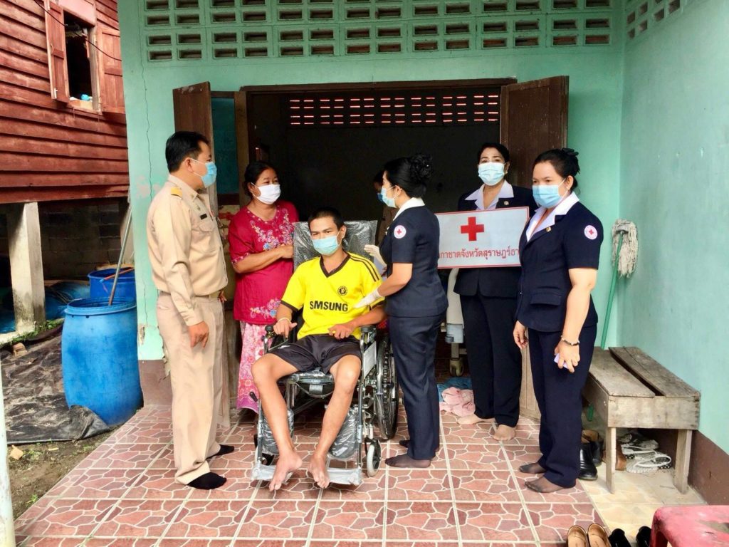 วันที่ 10 สิงหาคม 2563 นางอุรสา จินโต นายกเหล่ากาชาดจังหวัดสุราษฎร์ธานี พร้อมด้วยที่ปรึกษาฯ กรรมการเหล่ากาชาดจังหวัดฯและสมาชิกเหล่ากาชาดจังหวัดสุราษฎร์ธานีปลัดอำเภอดอนสัก สาธารณสุขอำเภอฯผู้ใหญ่บ้าน สารวัตรกำนัน และ อสม.ร่วมลงพื้นที่อำเภอดอนสัก จังหวัดสุราษฎร์ธานีเพื่อเยี่ยม นายโยธิฐ คมขำ อายุ 22 ปีบ้านเลขที่ 203 หมู่ที่ 1 ตำบลชลครามซึ่งเป็นผู้ป่วยติดเตียง ด้วยโรคสมองฝ่อและกล้ามเนื้ออ่อนแรง ในการนี้ เหล่ากาชาดจังหวัดสุราษฎร์ธานีได้มอบรถเข็นสำหรับนั่งให้จำนวน 1 คัน และมอบผ้าอ้อมสำเร็จรูปสำหรับผู้ใหญ่ ให้จำนวน 2 แพ็คเพื่อเป็นขวัญกำลังใจและบรรเทาทุกข์ในเบื้องต้น