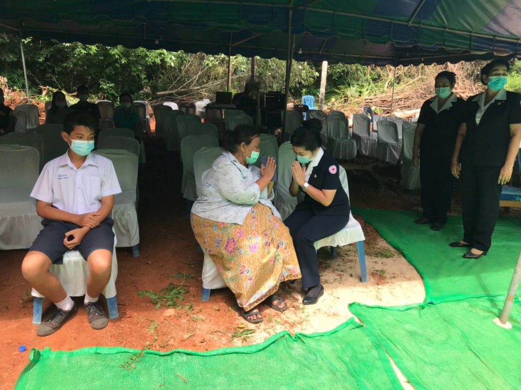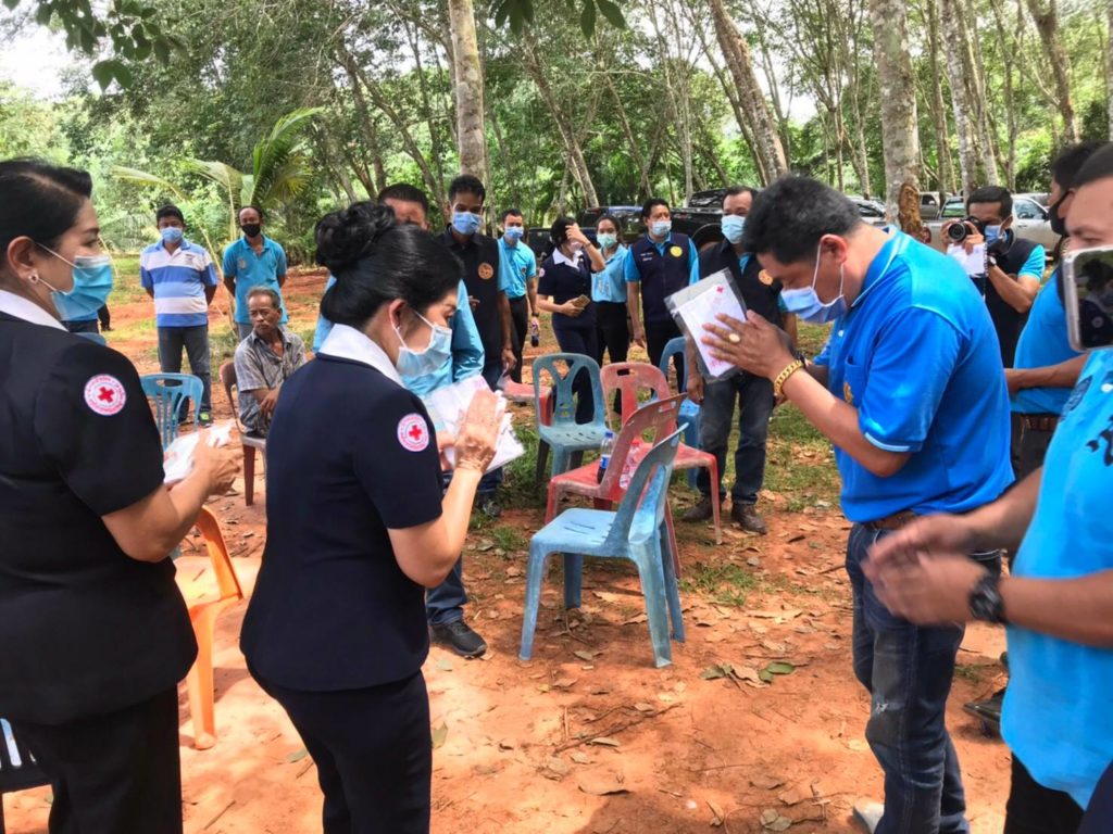 อำเภอไชยา พร้อมกันนี้เหล่ากาชาดจังหวัดสุราษฎร์ธานีได้แจกหน้ากากอนามัยแบบผ้าที่มีตราสัญลักษณ์ สภากาชาดไทยให้กับประชาชนและ อสม. ในพื้นที่เพื่อป้องกัน