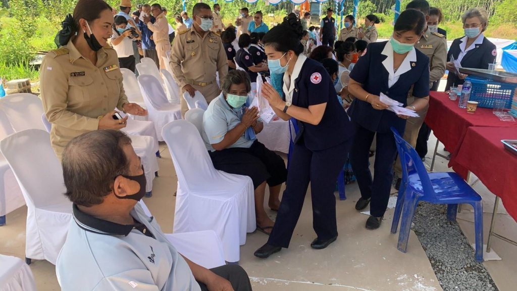 ทั้งสิ้น จำนวน 4,600,000 บาท ในวันนี้ได้มอบให้ราย นางแจ่ม ชูทัพ อายุ 84 ปีบ้านเลขที่ 158/1 หมู่ที่ 2 ตำบลเวียงสระ อำเภอเวียงสระ ทั้งนี้ นางอุรสา จินโต นายกเหล่ากาชาดจังหวัดสุราษฎร์ธานีได้ปลูกต้นไม้ 1 ต้น เพื่อเป็นกำลังใจให้กับนางแจ่ม ชูทัพ พร้อมกันนี้ เหล่ากาชาดจังหวัดสุราษฎร์ธานีได้แจกหน้ากากอนามัยแบบผ้าที่มีตราสัญลักษณ์ สภากาชาดไทยให้กับประชาชนและ อสม. ในพื้นที่เพื่อป้องกันการแพร่ระบาดของเชื้อไวรัสโคโรนา 2019 ด้วย