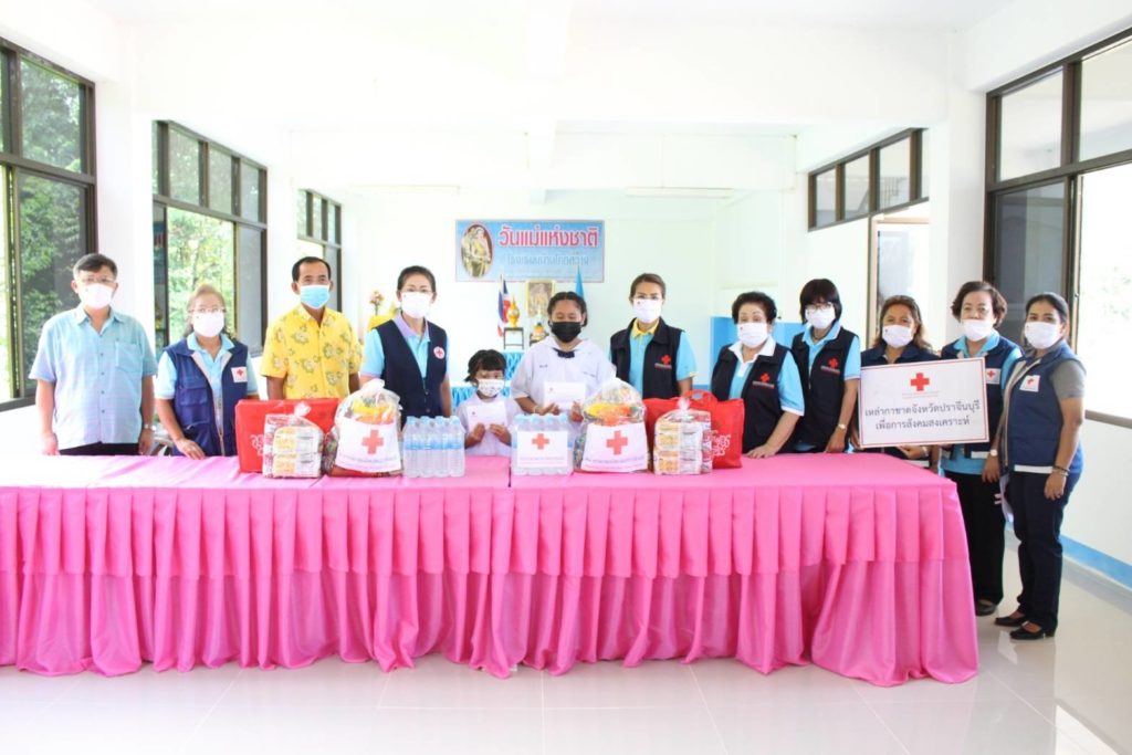 โดยเหล่ากาชาดจังหวัดปราจีนบุรี มอบหน้ากากอนามัยแบบผ้าตราสัญลักษณ์สภากาชาดไทยให้รายละ 5 ชิ้น เครื่องอุปโภคบริโภค รายละ 1 ชุด และน้ำดื่มบรรจุขวด