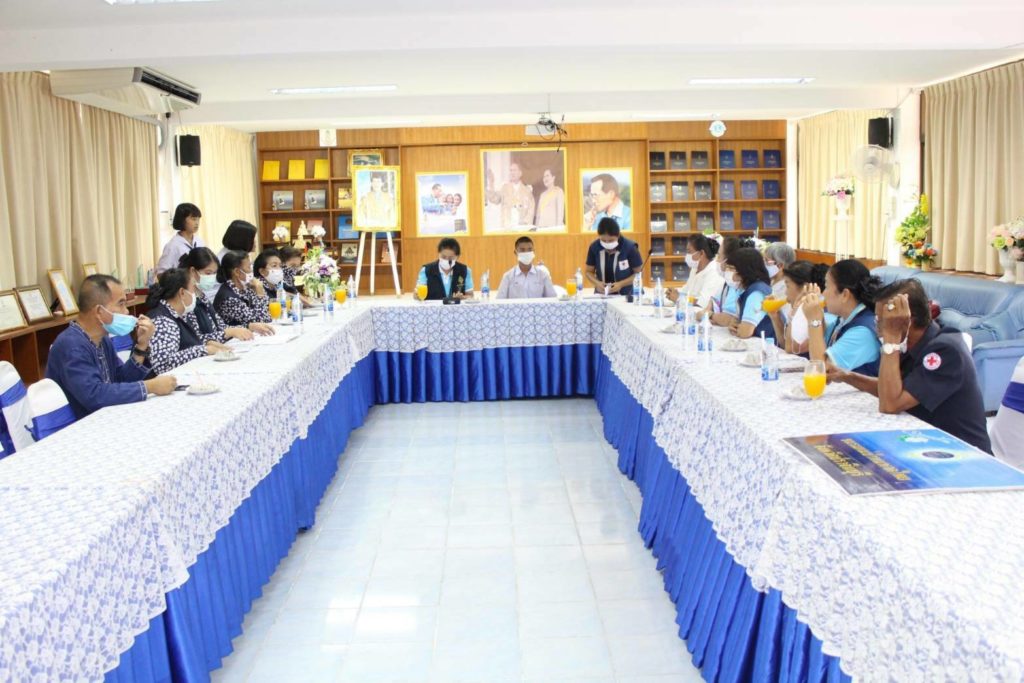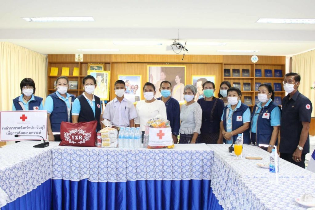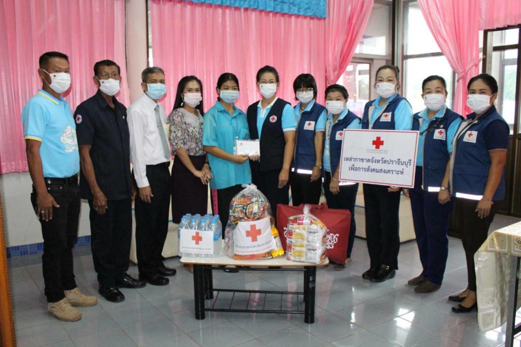 โดยเหล่ากาชาดจังหวัดปราจีนบุรี มอบหน้ากากอนามัยแบบผ้าตราสัญลักษณ์สภากาชาดไทยให้รายละ 5 ชิ้น เครื่องอุปโภคบริโภค