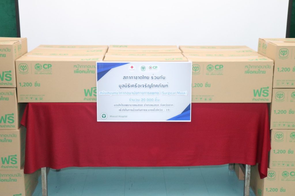 วันที่ 12 กันยายน 2563 ณ โรงพยาบาลแม่สอด อำเภอแม่สอด สำนักงานบริหารกิจการเหล่ากาชาด สภากาชาดไทย ร่วมกับมูลนิธิเจริญโภคภัณฑ์ บริจาค Surgical Mask จำนวน 20,000 ชิ้น เพื่อมอบให้กับโรงพยาบาลแม่สอด แม่ระมาด พบพระ ท่าสองยาง อุ้มผาง โดยนายอรรษิษฐ์ สัมพันธรัตน์ ผู้ว่าราชการจังหวัดตาก เป็นผู้รับมอบ พร้อมด้วยผู้อำนวยการโรงพยาบาลแม่สอด ผู้แทนเหล่ากาชาดจังหวัดตาก กิ่งกาชาดอำเภอแม่สอด สถานีกาชาดที่ 13 จังหวัดตาก ร่วมรับมอบ