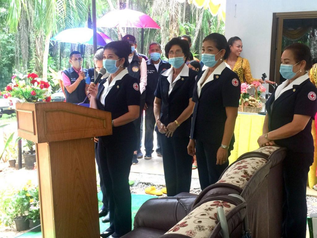 พร้อมกันนี้ เหล่ากาชาดจังหวัดสุราษฎร์ธานีได้แจกหน้ากากอนามัยแบบผ้าที่มีตราสัญลักษณ์ สภากาชาดไทยให้กับประชาชนและ อสม. ในพื้นที่เพื่อป้องกันการแพร่ระบาดของเชื้อไวรัสโคโรนา 2019 ด้วย