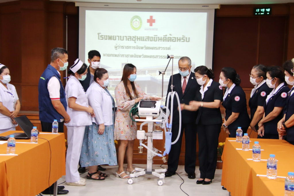 วันที่ 10 กันยายน 2563 ส่งมอบเครื่องช่วยหายใจ ชนิดควบคุมด้วยปริมาตรและความดัน พร้อมเครื่องผลิตอากาศภายในตัวเครื่องแบบเคลื่อนที่ จำนวน 1 เครื่อง ให้กับโรงพยาบาลชุมแสง ซึ่งจัดซื้อโดยงบประมาณของเหล่ากาชาดจังหวัดนครสวรรค์ มูลค่า 450,000 บาท ทั้งนี้ เพื่อรองรับผู้ป่วยที่มีปัญหาระบบทางเดินหายใจ และผู้ป่วยที่ได้รับผลกระทบจากโรคติดเชื้อไวรัสโคโรนา 2019 ณ โรงพยาบาลชุมแสง อำเภอชุมแสง จังหวัดนครสวรรค์