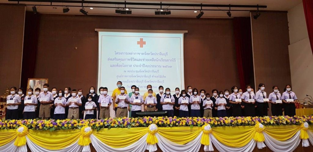 วันที่ 24 กันยายน 2563 หอประชุมจังหวัดปราจีนบุรี จังหวัดปราจีนบุรี นางอังคณา หัตถกิจโกศล นายกเหล่ากาชาดจังหวัดปราจีนบุรี ปลัดจังหวัด/เลขานุการเหล่ากาชาด หัวหน้าส่วนราชการ นายอำเภอ/ผู้แทน ที่ปรึกษา กรรมการและสมาชิกเหล่ากาชาดจังหวัดปราจีนบุรี ร่วมพิธีมอบทุนการศึกษาตามโครงการเหล่ากาชาดจังหวัดปราจีนบุรีส่งเสริมคุณภาพชีวิตและช่วยเหลือนักเรียนยากไร้ ด้อยโอกาส ประจำปี 2563 จำนวน 182 ทุน ให้แก่นักเรียนยากไร้ ด้อยโอกาส ในพื้นที่จังหวัดปราจีนบุรี เพื่อให้การช่วยเหลือ สนับสนุนทุนการศึกษาสำหรับเด็กยากไร้ ด้อยโอกาส แบ่งเบาภาระของผู้ปกครอง