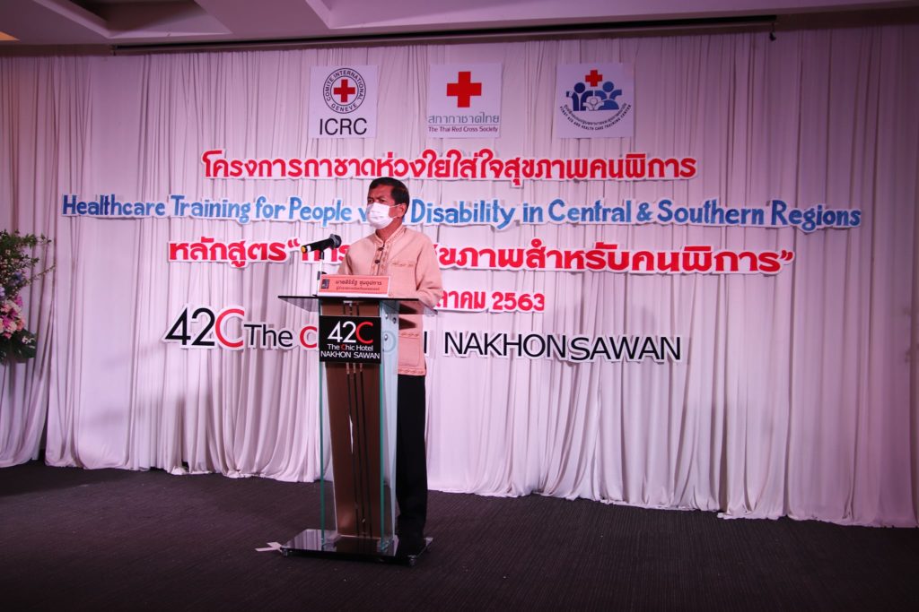 โดยมี นายสิริรัฐ ชุมอุปการ ผู้ว่าราชการจังหวัดนครสวรรค์ เป็นประธานในพิธีฯ ซึ่งการอบรมฯ จัดโดย ศูนย์ฝึกอบรมปฐมพยาบาลและสุขภาพอนามัย สภากาชาดไทย และมีผู้ช่วยศาสตราจารย์ศิริพร พุทธรังสี ผู้อำนวยการศูนย์ฝึกอบรมปฐมพยาบาลและสุขภาพอนามัย สภากาชาดไทย กล่าวรายงานวัตถุประสงค์การจัดอบรมฯ คือ สภากาชาดไทยเล็งเห็นความสำคัญของการส่งเสริมและพัฒนาคุณภาพชีวิตผู้พิการ โดยรับคนพิการเข้าปฏิบัติงานในหน่วยงานของสภากาชาดไทยทั้งในส่วนกลางและภูมิภาคทั่วประเทศ จำนวนทั้งสิ้น 951 คน และยังเล็งเห็นความสำคัญของการส่งเสริมสุขภาพคนพิการที่ปฏิบัติงานในหน่วยงานต่างๆ ของสภากาชาดไทย ให้มีความรู้ และทักษะในการประเมินภาวะสุขภาพ และการดูแลสุขภาพเบื้องต้นของตนเองได้