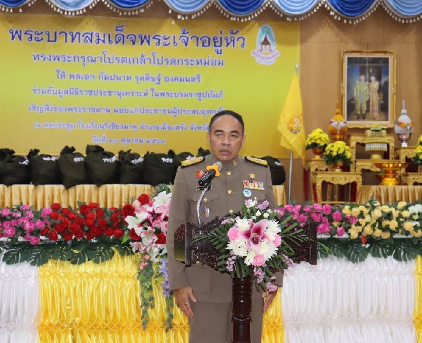 วันที่ 30 ตุลาคม 2563 พระบาทสมเด็จพระเจ้าอยู่หัว ทรงพระกรุณาโปรดเกล้า โปรดกระหม่อมให้พลเอก กัมปนาท รุดดิษฐ์ องคมนตรี ร่วมกับมูลนิธิราชประชานุเคราะห์ ในพระบรมราชูปถัมภ์ เชิญสิ่งของพระราชทาน มอบแก่ประชาชนผู้ประสบอุทกภัย ณ หอประชุม โรงเรียนวิเชียรมาตุ อำเภอเมืองตรัง จังหวัดตรัง โดยมี นายขจรศักดิ์ เจริญโสภา ผู้ว่าราชการจังหวัดตรัง กล่าวรายงาน จากนั้น องคมนตรีได้กล่าวถึงวัตถุประสงค์ และเชิญพระราชกระแสรับสั่งของพระบาทสมเด็จพระเจ้าอยู่หัวในการเชิญสิ่งของพระราชทาน(จำนวน 990 ชุด) เพื่อเป็นขวัญกำลังใจแก่ประชาชนและมอบเงินสงเคราะห์แก่ครอบครัวผู้เสียชีวิต จำนวน 10,000 บาท ของมูลนิธิราชประชานุเคราะห์ แก่นางสงวน บุญสนอง (มารดาของนายคนอง บุญสนอง ผู้เสียชีวิตจากอุทกภัย) และมอบสิ่งของพระราชทานจำนวน 1 ชุด ในการนี้ นางละมัย เจริญโสภา นายกเหล่ากาชาดจังหวัดตรัง มอบหมายให้นางลักษณาพร อนันต์วรปัญญา รองนายกเหล่ากาชาดจังหวัดตรัง พร้อมคณะกรรมการและสมาชิกเหล่ากาชาดร่วมพิธี
