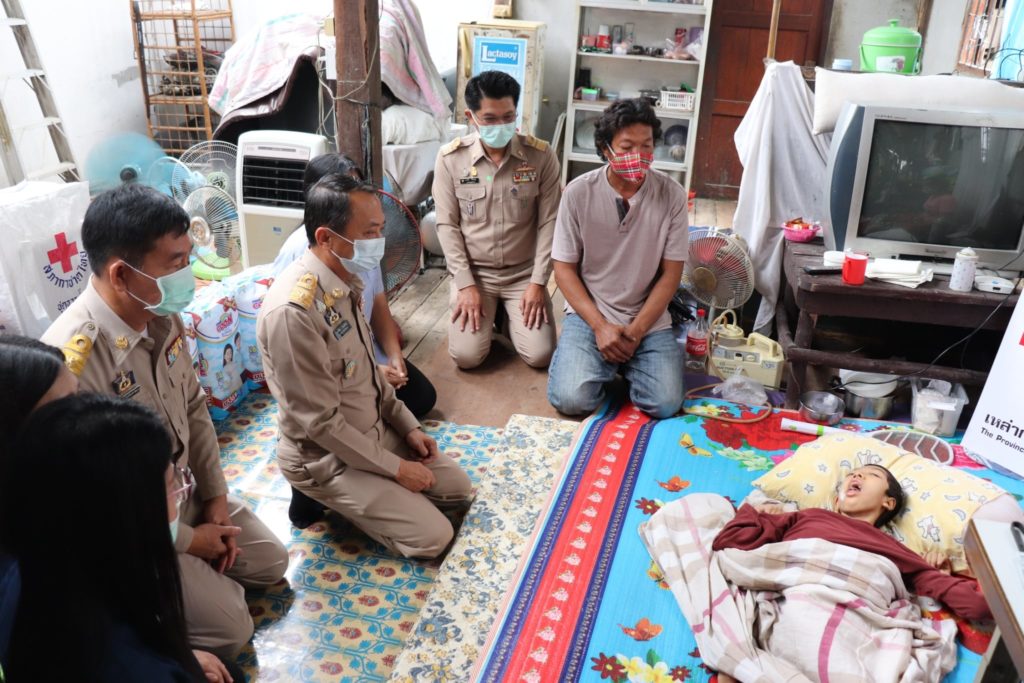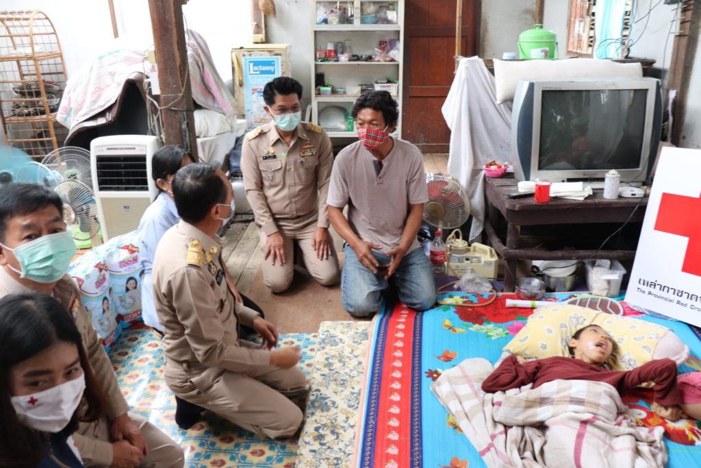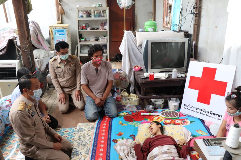 วันที่ 12 พฤศจิกายน 2563 นายพงศ์รัตน์ ภิรมย์รัตน์ ผู้ว่าราชการจังหวัดตาก ในฐานะประธานที่ปรึกษาคณะกรรมการเหล่ากาชาดจังหวัดตาก และนางศลิษา ภิรมย์รัตน์ นายกเหล่ากาชาดจังหวัดตาก จัดกิจกรรม “ วันผู้ว่าฯและนายกเหล่ากาชาด บรรเทาทุกข์ บำรุงสุข ปวงประชา “ เพื่อแก้ไขปัญหาและช่วยเหลือประชาชนผู้เดือดร้อน ตามนโยบายสำนักบริหารกิจการเหล่ากาชาด โดยมีนายสมชาย ไตรทิพย์ชาติสกุล นายอำเภอเมืองตาก ปลัดอำเภอเมืองตาก ผู้ช่วยเลขานุการเหล่ากาชาดจังหวัดตาก สาธารณสุขจังหวัดตาก อสม.ประจำหมู่บ้าน และกรรมการ/สมาชิกเหล่ากาชาดจังหวัดตาก ได้เดินทางไปบ้านเลขที่ 169/1 หมู่ที่ 5 ตำบลน้ำรึม อำเภอเมืองตาก ร่วมเยี่ยมพูดคุยและให้กำลังใจผู้ป่วยติดเตียงยากไร้ ราย นางสาวยมลพร เพชรเภรี อายุ 15 ปี เป็นผู้ป่วยพิการติดเตียง ยากไร้ รายได้ไม่เพียงพอ