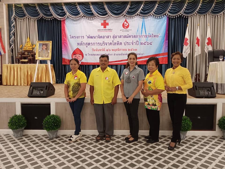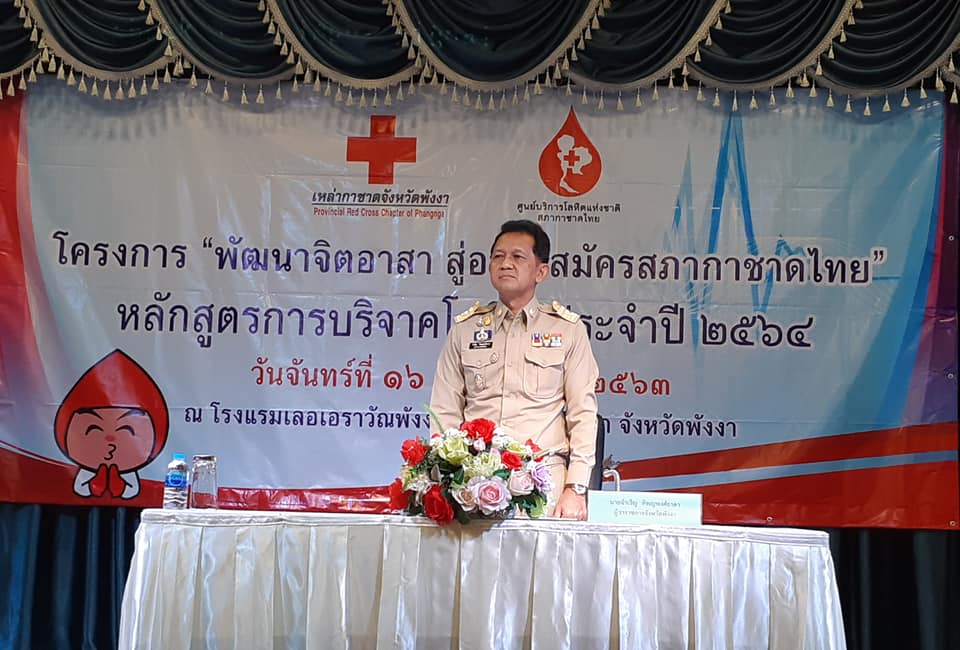 วันที่ 16 พฤศจิกายน 2563 ที่โรงแรมเลอเอราวัณพังงา อำเภอเมืองพังงา สำนักงานเหล่ากาชาดจังหวัดพังงา จัดโครงการ “พัฒนาจิตอาสา สู่อาสาสมัครสภากาชาดไทย” หลักสูตรการบริจาคโลหิต ประจำปีงบประมาณ 2564 โดยมีนายจำเริญ ทิพญพงศ์ธาดา ผู้ว่าราชการจังหวัดพังงา เป็นประธานเปิด เพื่อให้อาสาสมัครได้มีความรู้ ความเข้าใจ ในการคัดกรองผู้บริจาคโลหิตสามารถชี้แจงถึงเหตุผล สามารถตอบคำถามผู้บริจาคโลหิตได้อย่างมีประสิทธิภาพ ให้อาสาสมัครเป็นแกนนำในระดับชุมชน ช่วยเผยแพร่และประชาสัมพันธ์จัดหาผู้บริจาคโลหิตให้เพียงพอต่อการใช้โลหิต รวมถึงสร้างเครือข่ายอาสาสมัครที่ยั่งยืน และเข้มแข็งในระดับอำเภอและจังหวัด สามารถเป็นแกนนำในการรณรงค์เชิญชวนบริจาคโลหิตได้ และเพื่อเพิ่มจำนวนผู้บริจาคโลหิตให้มีปริมาณมากขึ้น