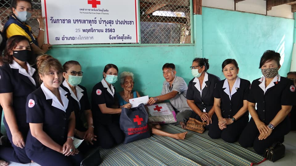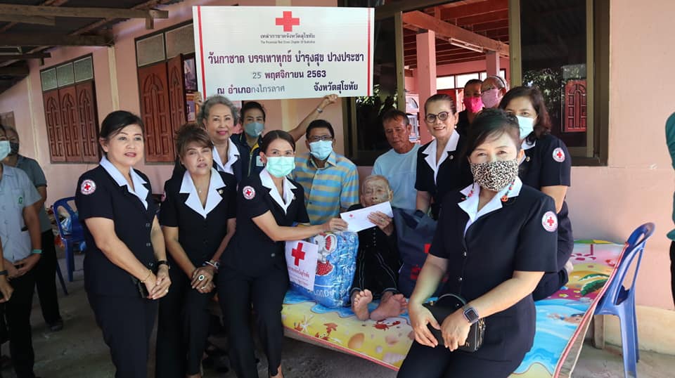 วันที่ 25 พฤศจิกายน 2563 นางกนกพร พรรณเทวี นายกเหล่ากาชาดจังหวัดสุโขทัย พร้อมด้วยนางพร้อมจันทร์ ทีคะสุข รองนายกเหล่ากาชาดจังหวัดสุโขทัย พัฒนาสังคมและความมั่นคงของมนุษย์จังหวัดสุโขทัย และคณะกรรมการกาชาดจังหวัดสุโขทัย ลงพื้นที่เยี่ยมผู้สูงอายุ 100 ปีขึ้นไป ในพื้นที่อำเภอกงไกรลาศ จำนวน 4 ราย ดังนี้