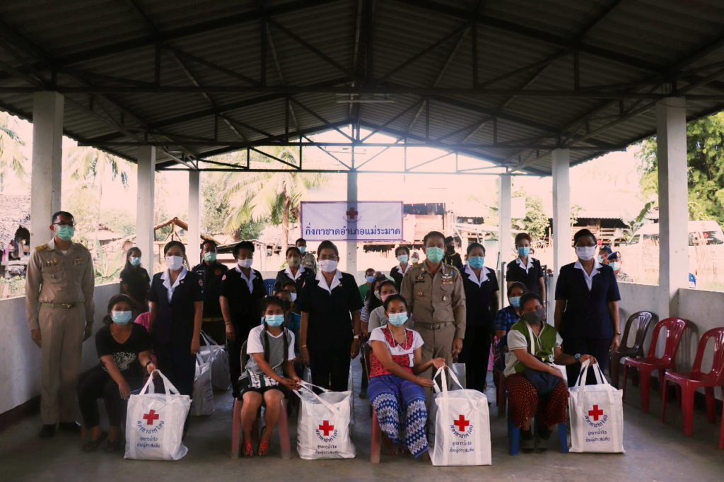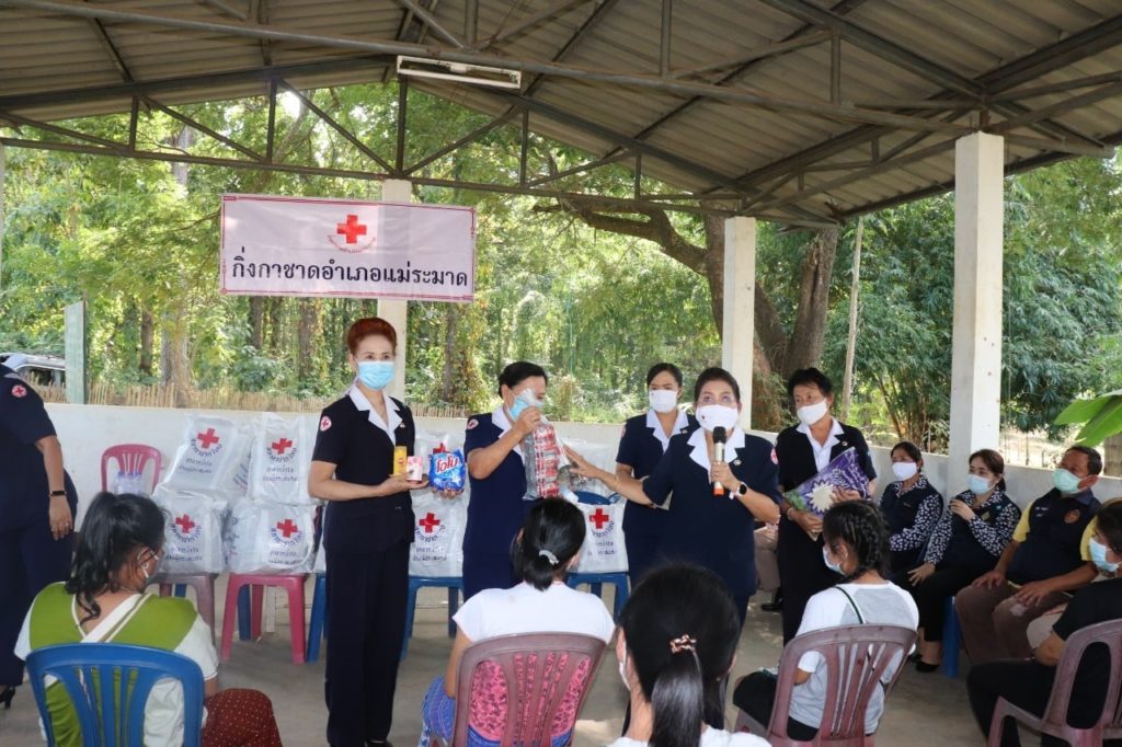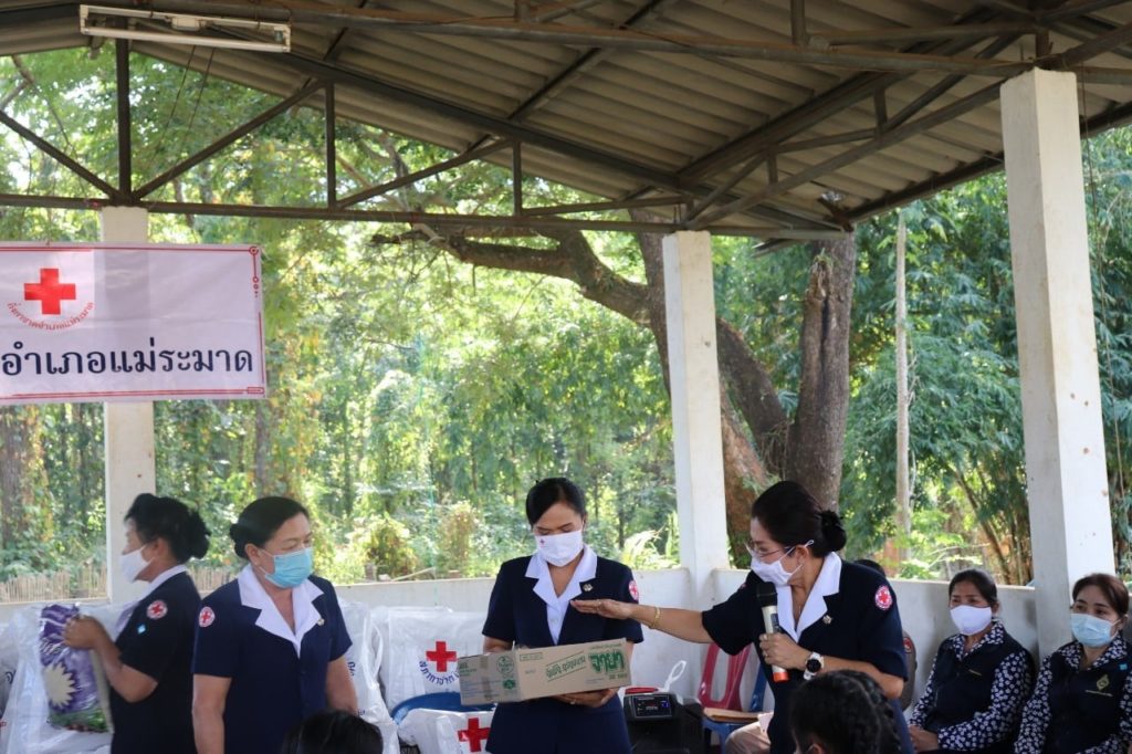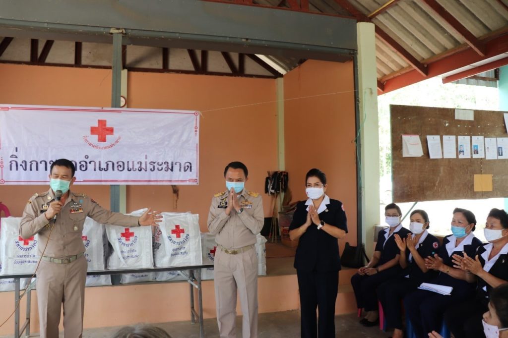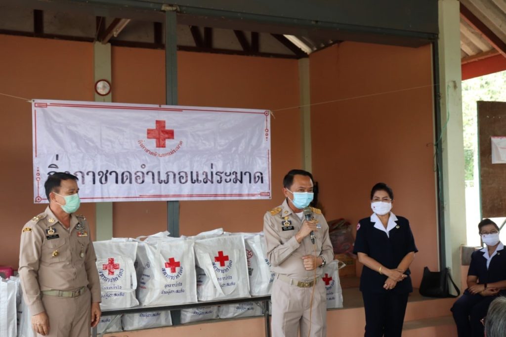 วันที่ 30 พฤศจิกายน 2563 นายพงศ์รัตน์ ภิรมย์รัตน์ ผู้ว่าราชการจังหวัดตาก ประธานที่ปรึกษาคณะกรรมการเหล่ากาชาดจังหวัดตาก พร้อมด้วย นางศลิษา ภิรมย์รัตน์ นายกเหล่ากาชาดจังหวัดตาก นางวรรณฤดี กิจเจริญรุ่งโรจน์ รองนายกเหล่ากาชาดจังหวัดตาก ร่วมมอบชุดธารน้ำใจให้แก่ผู้ได้รับผลกระทบจากการระบาดของเชื้อไวรัสโควิด-19 จำนวน 105 ราย ณ อำเภอแม่ระมาด โดยมี นายเลิศศักดิ์ ทับผึ้ง นายอำเภอแม่ระมาด นางโสภา ทับผึ้ง นายกกิ่งกาชาดอำเภอแม่ระมาด และกรรมการ/สมาชิกกิ่งกาชาดอำเภอแม่ระมาด ให้การต้อนรับและร่วมกิจกรรม