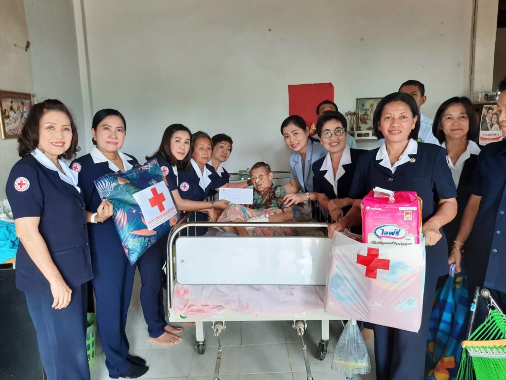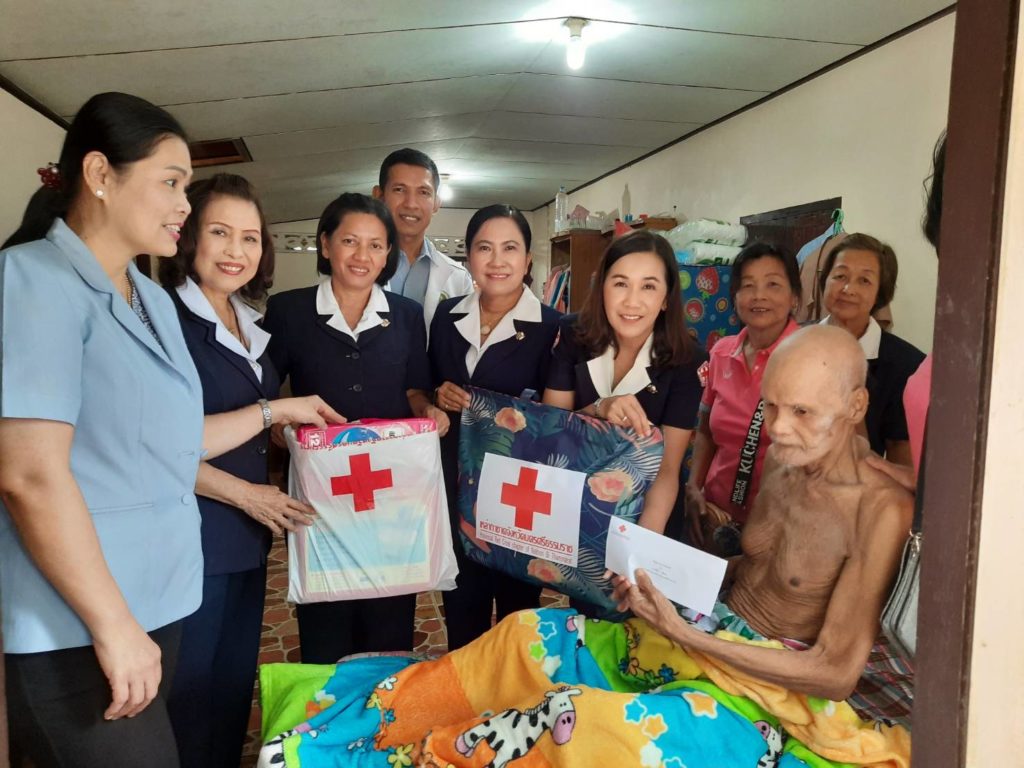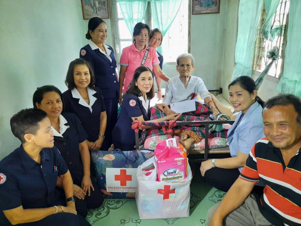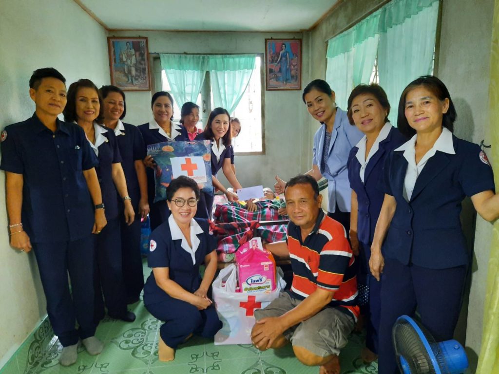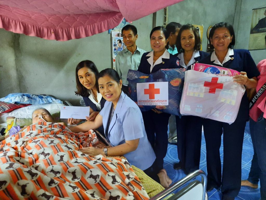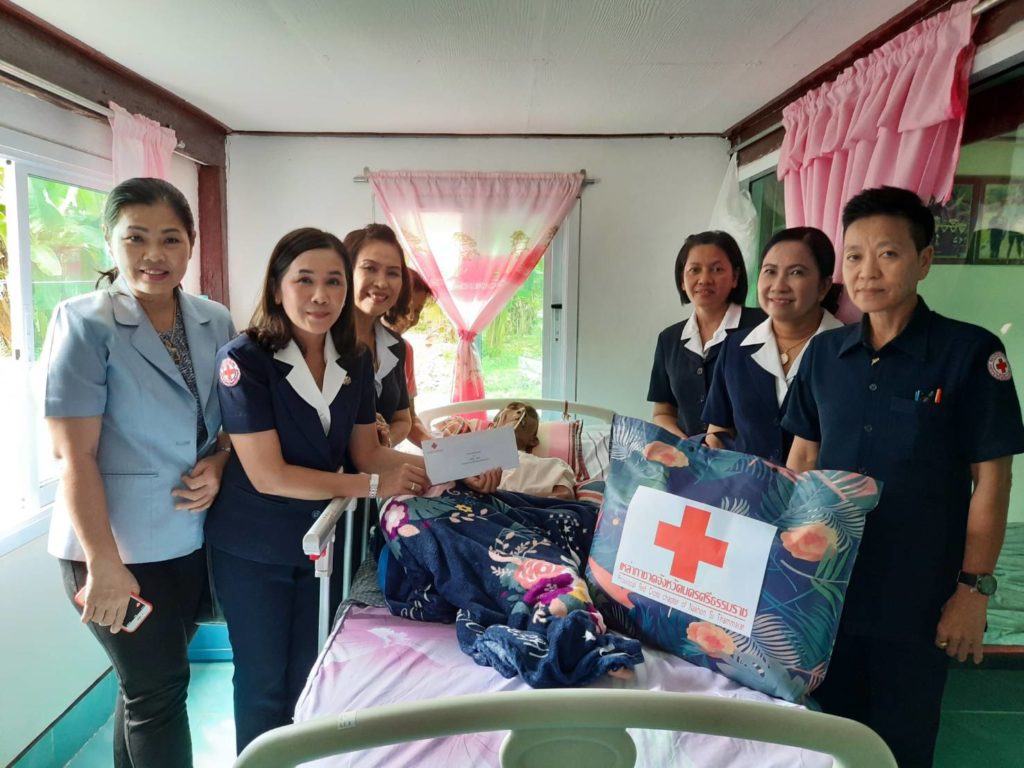 พร้อมด้วยคณะกรรมการเหล่ากาชาดจังหวัดนครศรีธรรมราชเยี่ยมและให้กำลังผู้ป่วยติดเตียงพร้อมมอบเครื่องอุปโภคบริโภคและเงินจำนวน 1,000 บาท ณ พื้นที่อำเภอนาบอน