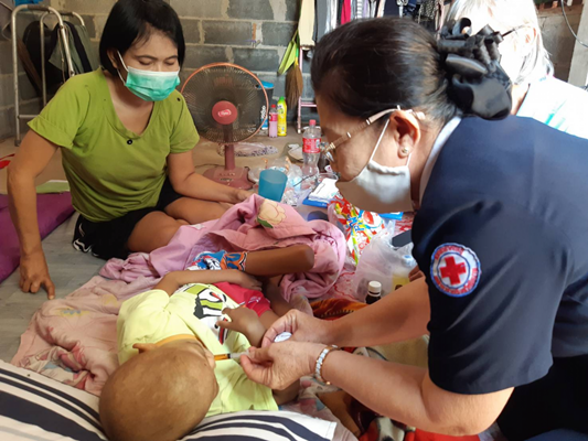 วันที่ 9 ธันวาคม 2563 นางจุฬาภร ศิริเวช นายกเหล่ากาชาดจังหวัดชัยนาท มอบหมายให้คณะกรรมการและสมาชิกเหล่ากาชาดจังหวัดชัยนาท ร่วมกับบ้านพักเด็กและครอบครัวจังหวัดชัยนาท สำนักงานพัฒนาสังคมและความมั่นคงของมนุษย์จังหวัดชัยนาท,ศูนย์คุ้มครองคนไร้ที่พึ่งจังหวัดชัยนาท,อำเภอสรรคบุรี ลงพื้นที่เยี่ยมและให้กำลังใจ พร้อมมอบถุงยังชีพ น้ำดื่ม ให้แก่ครอบครัวนางสีสด มันพุก บ้านเลขที่ 58/1 หมู่ที่ 15 ตำบลแพรกศรีราชา อำเภอสรรคบุรี จังหวัดชัยนาท ซึ่งมีหลานชาย อายุ 5 ปี ป่วยเป็นมะเร็งระยะสุดท้าย สภาพครอบครัวมีความยากลำบาก รายได้ไม่เพียงพอต่อการครองชีพ/เหล่ากาชาดจังหวัดชัยนาท